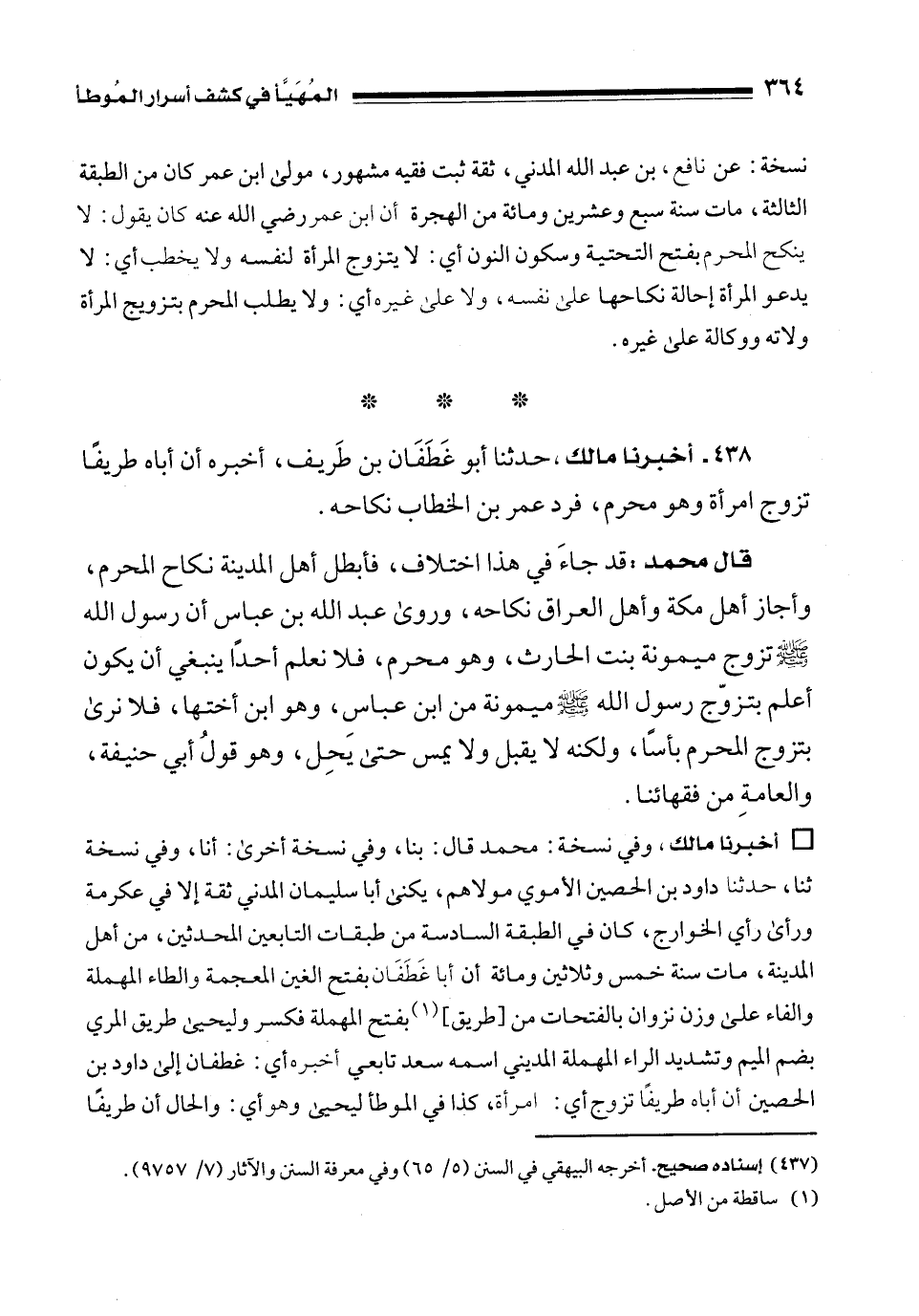 438 - أخبرنا مالك، حدثنا أبو غَطَفَان بن طَريف، أخبره أن أباه طريفًا تزوج امرأة وهو محرم، فرد عمر بن الخطاب نكاحه.