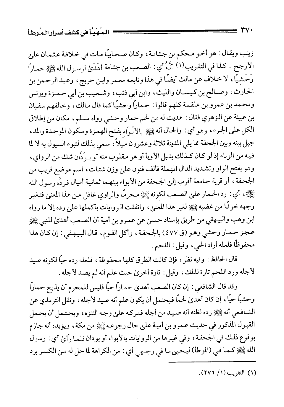 زينب ويقال: هو أخو محكم بن جثامة، وكان صحابيًا مات في خلافة عثمان على الأرجح. كذا في التقريب (¬1) أنَّهُ أي: الصعب بن جثامة أهْدَى لرسول الله - صلى الله عليه وسلم - حمارًا وَحْشِيًا، لا خلاف عن مالك أيضًا في هذا وتابعه معمر وابن جريج، وعبد الرحمن بن الحارث، وصالح بن كيسان والليث، وابن أبي ذئب، وشعيب بن أبي حمزة ويونس ومحمد بن عمرو بن علقمة كلهم قالوا: حمارًا وحشيًا كما قال مالك، وخالفهم سفيان بن عيينة عن الزهري فقال: هديت له من لحم حمار وحشي رواه مسلم، مكان من إطلاق الكل على الجزء، وهو أي: والحال أنه - صلى الله عليه وسلم - بالأبْوَاءِ بفتح الهمزة وسكون الموحدة والمد، جبل بينه وبين الجحفة مما يلي المدينة ثلاثة وعشرون مَيلًا، سمي بذلك لتبوء السيول به لا لما فيه من الوباء إذ لو كان كذلك يقبل الأوبأ أو هو مقلوب منه أو بوَدَّان شك من الرواي، وهو بفتح الواو وتشديد الدال المهملة فألف فنون على وزن شتات، اسم موضع قريب من الجحفة، أو قرية جامعة أقرب إلى الجحفة من الأبواء بينهما ثمانية أميال فردَّه رسول الله - صلى الله عليه وسلم -، أي: رد الحمار على الصعب لكونه - صلى الله عليه وسلم - محرمًا والراوي غافل عن هذا المعنى فتغير وجهه خوفًا من غضبه - صلى الله عليه وسلم - لغير هذا المعنى، واتفقت الروايات بأكملها على رده إلا ما رواه ابن وهب والبيهقي من طريق بإسناد حسن عن عمرو بن أمية أن الصعب أهدى للنبي - صلى الله عليه وسلم - عجز حمار وحشي وهو (ق 477) بالجحفة، وأكل القوم، قال البيهقي: إن كان هذا محفوظًا فلعله أراد الحي، وقيل: اللحم.