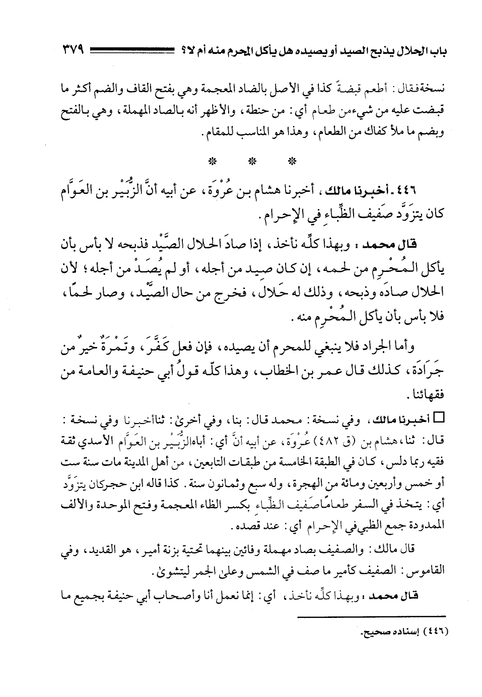 446 - أخبرنا مالك، أخبرنا هشام بن عُرْوَة، عن أبيه أنَّ الزُّبَيْر بن العَوَّام كان يتزَوَّد صَفيف الظِّباءِ في الإِحرام.