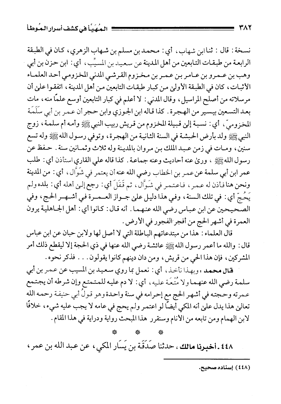 نسخة: قال: ثنا ابن شهاب، أي: محمد بن مسلم بن شهاب الزهري، كان في الطبقة الرابعة من طبقات التابعين من أهل المدينة عن سعيد بن المسِّيب، أي: ابن حزن بن أبي وهب بن عمرو بن عامر بن عمر بن مخزوم القرشي المدني المخزومي أحد العلماء الأثبات، كان في الطبقة الأولى من كبار طبقات التابعين من أهل المدينة، اتفقوا على أن مرسلاته من أصلح المراسيل، وقال المدني: لا أعلم في كبار التابعين أوسع علمًا منه، مات بعد التسعين بيسير من الهجرة. كذا قاله ابن الجوزي وابن حجر أن عمر بن أبي سَلَمَة المخزوميّ، أي: نسبة إلى قبيلة المخزوم من قريش ربيب النبي - صلى الله عليه وسلم - وأمه أم سلمة، زوج النبي - صلى الله عليه وسلم - ولد بأرض الحبشة في السنة الثانية من الهجرة، وتوفي رسول الله - صلى الله عليه وسلم - وله تسع سنين، ومات في زمن عبد الملك بن مروان بالمدينة وله ثلاث وثمانين سنة. حفظ عن رسول الله - صلى الله عليه وسلم -، ورى عنه أحاديث وعنه جماعة. كذا قاله علي القاري استأذن أي: طلب عمر ابن أبي سلمة عن عمر بن الخطاب رضي الله عنه أن يعتمر في شَوَّال، أي: من المدينة ونحن هنا فأذن له عمر، فاعتمر في شَوَّال، ثم قَفَلَ أي: رجع إلى أهله أي: بلده ولم يَحُجّ أي: في تلك السنة، وفي هذا دليل على جواز العمرة في أشهر الحج، وفي الصحيحين عن ابن عباس رضي الله عنهما. أنه قال: كانوا أي: أهل الجاهلية يرون العمرة في أشهر الحج من أفجر الفجور في الأرض.