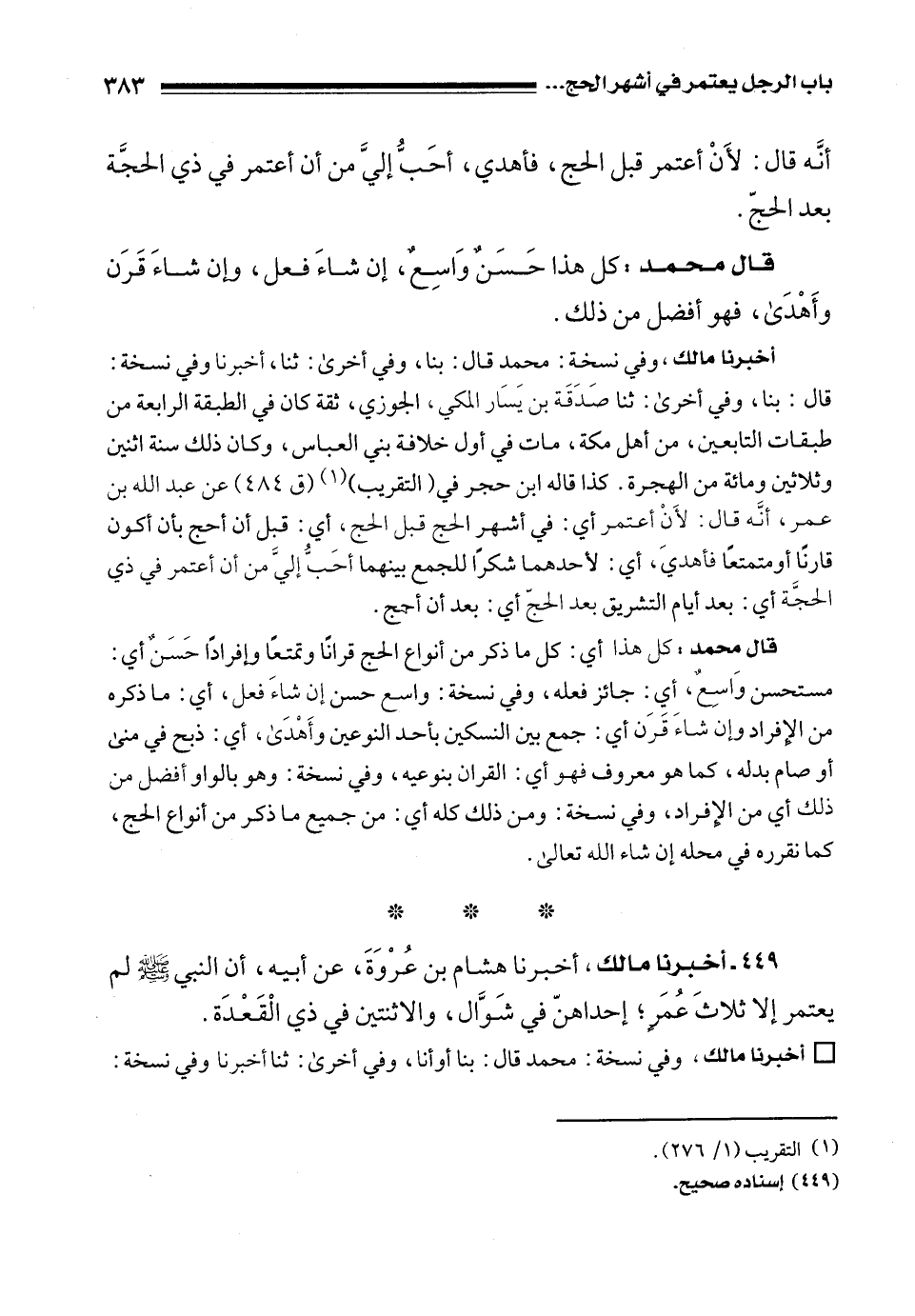 أخبرنا مالك، وفي نسخة: محمد قال: بنا، وفي أخرى: ثنا، أخبرنا وفي نسخة: قال: بنا، وفي أخرى: ثنا صَدَقَة بن يَسَار المكي، الجوزي، ثقة كان في الطبقة الرابعة من طبقات التابعين، من أهل مكة، مات في أول خلافة بني العباس، وكان ذلك سنة اثنين وثلاثين ومائة من الهجرة. كذا قاله ابن حجر في (التقريب) (¬1) (ق 484) عن عبد الله بن عمر، أنَّه قال: لأَنْ أعتمر أي: في أشهر الحج قبل الحج، أي: قبل أن أحج بأن أكون قارنًا أو متمتعًا فأهديَ، أي: لأحدهما شكرًا للجمع بينهما أحَبُّ إليَّ من أن أعتمر في ذي الحجَّة أي: بعد أيام التشريق بعد الحجّ أي: بعد أن أحج.
