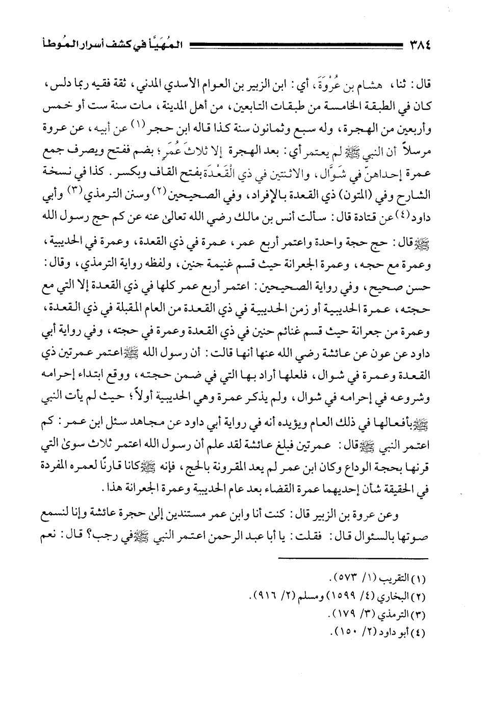 وعن عروة بن الزبير قال: كنت أنا وابن عمر مستندين إلى حجرة عائشة وإنا لنسمع صوتها بالسؤال قال: فقلت: يا أبا عبد الرحمن اعتمر النبي - صلى الله عليه وسلم - في رجب؟ قال: نعم