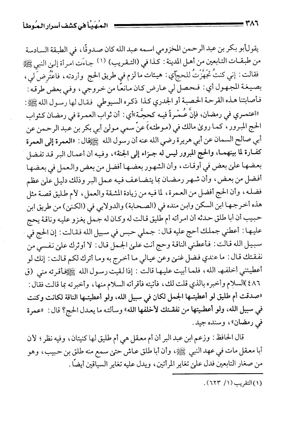 يقول أبو بكر بن عبد الرحمن المخزومي اسمه عبد الله كان صدوقًا، في الطبقة السادسة من طبقات التابعين من أهل المدينة: كذا في (التقريب) (¬1) جاءَت امرأة إلى النبي - صلى الله عليه وسلم - فقالت: إني كنتُ تجَهَّزْتُ للحجّ أي: هيئات ما لزم في طريق الحج وأردته، فاعْتُرِضَ لي، بصيغة المجهول أي: فحصل لي عارض كان مانعًا من خروجي، وفي بعض طرقه: فأصابتنا هذه القرحة الحصبة أو الجدري كذا ذكره السيوطي فقال لها رسول الله - صلى الله عليه وسلم -: "اعتمري في رمضان، فإنَّ عُمْرةً فيه كحِجَّة" أي: أن ثواب العمرة في رمضان كثواب الحج المبرور، كما روى مالك في (موطئه) عن سمي مولى أبي بكر بن عبد الرحمن عن أبي صالح السمان عن أبي هريرة رضي الله عنه أن رسول الله - صلى الله عليه وسلم - قال: "العمرة إلى العمرة كفارة لما بينهما، والحج المبرور ليس له جزاء إلى الجنة"، وفيه أن أعمال البر قد تفضل بعضها على بعض في أوقات، وأن الشهور بعضها أفضل من بعض والعمل في بعضها أفضل من بعض، وأن شهر رمضان بما يتضاعف فيه عمل البر وذلك دليل على عظم فضله، وأن الحج أفضل من العمرة، لما فيه من زيادة المشقة والعمل، لأم طليق قصة مثل هذه أخرجها ابن السكن وابن منده في (الصحابة) والدولابي في (الكنى) من طريق ابن حبيب أن أبا طلق حدثه أن امرأته أم طليق قالت له وكان له جمل يغزو عليه وناقة يحج عليها: أعطني جملك أحج عليه قال: جملي حبس في سبيل الله فقالت: إن الحج في سبيل الله قالت: فأعطني الناقة وحج أنت على الجمل قال: لا أوثرك على نفسي من نفقتك قال: ما عندي فضل غنى وعن عيالي ما أخرج به وما أترك لكم قالت: إنك لو أعطيتني أخلفه الله، فلما أبيت عليها قالت: إذا لقيت رسول الله - صلى الله عليه وسلم - فأقرئه مني (ق 486) السلام وأخبره بالذي قلت لك، فأتيته فأقرأته السلام منها، وأخبرته بما قالت فقال: "صدقت أم طليق لو أعطيتها الجمل لكان في سبيل الله، ولو أعطيتها الناقة لكانت وكنت في سبيل الله، ولو أعطيتها من نفقتك لأخلفها الله" وسألته ما يعدل الحج؟ قال: "عمرة في رمضان"، وسنده جيد.