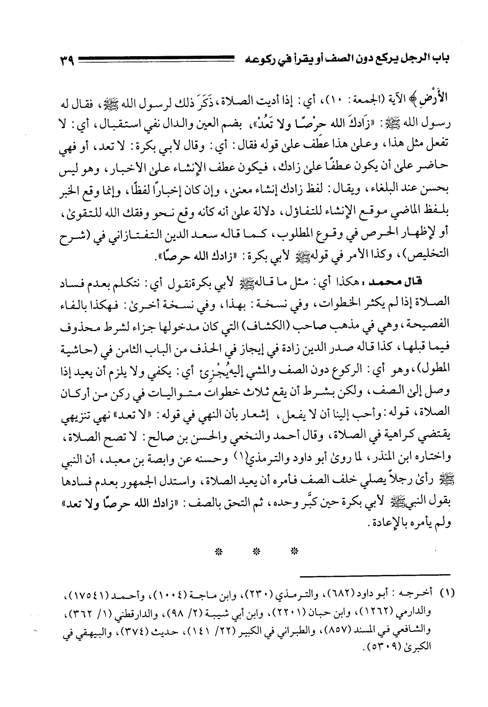 قال محمد: هكذا أي: مثل ما قاله - صلى الله عليه وسلم - لأبي بكرة نقول أي: نتكلم بعدم فساد الصلاة إذا لم يكثر الخطوات، وفي نسخة: بهذا، وفي نسخة أخرى: فهكذا بالفاء الفصيحة، وهي في مذهب صاحب (الكشاف) التي كان مدخولها جزاء لشرط محذوف فيما قبلها، كذا قاله صدر الدين زادة في إيجاز في الحذف من الباب الثامن في (حاشية المطول)، وهو أي: الركوع دون الصف والمشي إليه يُجْزِئ أي: يكفي ولا يلزم أن يعيد إذا وصل إلى الصف، ولكن بشرط أن يقع ثلاث خطوات متواليات في ركن من أركان الصلاة، قوله: وأحب إلينا أن لا يفعل، إشعار بأن النهي في قوله: "لا تعد" نهي تنزيهي يقتضي كراهية في الصلاة، وقال أحمد والنخعي والحسن بن صالح: لا تصح الصلاة، واختاره ابن المنذر، لما روى أبو داود والترمذي (¬1) وحسنه عن وابصة بن معبد، أن النبي - صلى الله عليه وسلم - رأى رجلًا يصلي خلف الصف فأمره أن يعيد الصلاة، واستدل الجمهور بعدم فسادها بقول النبي - صلى الله عليه وسلم - لأبي بكرة حين كبَّر وحده، ثم التحق بالصف: "زادك الله حرصًا ولا تعد" ولم يأمره بالإِعادة.