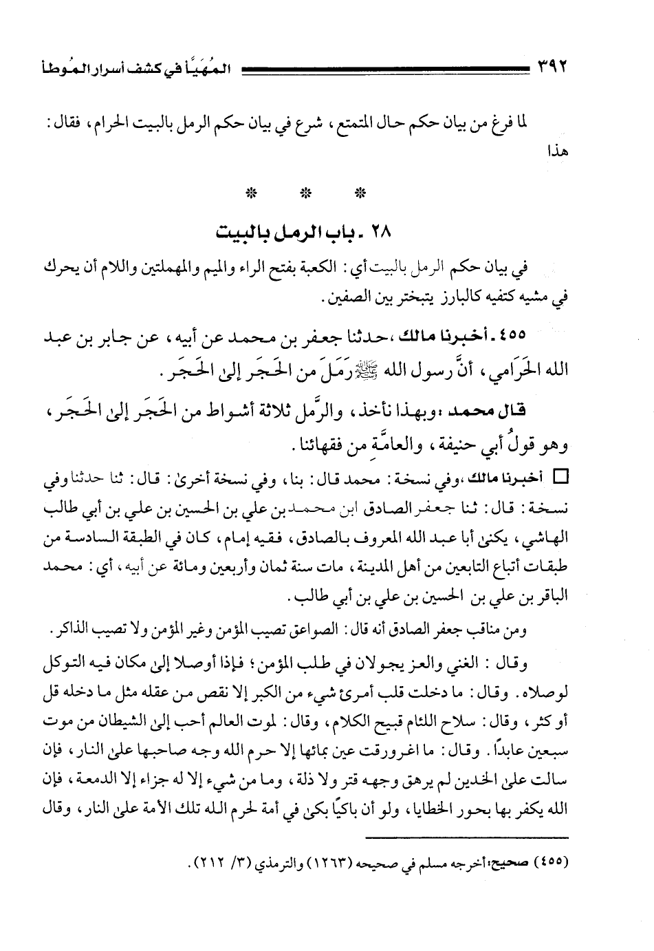 455 - أخبرنا مالك، حدثنا جعفر بن محمد عن أبيه، عن جابر بن عبد الله الحَرَامي، أنَّ رسول الله - صلى الله عليه وسلم - رَمَلَ من الحَجَر إلى الحَجَر.