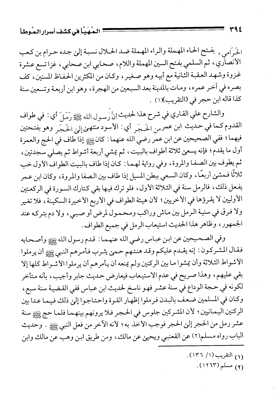 وفي الصحيحين عن ابن عباس رضي الله عنهما: قدم رسول الله - صلى الله عليه وسلم - وأصحابه فقال المشركون: إنه يقدم عليكم وقد هنتهم حمى يثرب فأمرهم النبي - صلى الله عليه وسلم - أن يرملوا الأشواط الثلاثة وأن يمشوا ما بين الركنين ولم يمنعه أن يأمرهم أن يرملوا الأشواط كلها إلا بقي عليهم، وهذا صريح في عدم الاستيعاب فيعارض حديث جابر وأجيب، بأنه متأخر لكونه في حجة الوداع في سنة عشر فهو ناسخ لحديث ابن عباس ففي القضية سنة سبع، وكان في المسلمين ضعف بالبدن فرملوا إظهار القوة واحتاجوا إلى ذلك فيما عدا بين الركنين اليمانيين؛ لأن المشركين جلوس في الحجر فلا يرونهم بينهما فلما حج - صلى الله عليه وسلم - سنة عشر رمل من الحجر إلى الحجر فوجب الأخذ به؛ لأنه الآخر من فعل النبي - صلى الله عليه وسلم -. وحديث الباب رواه مسلم (¬2) عن القعنبي ويحيى عن مالك، ومن طريق ابن وهب عن مالك وابن