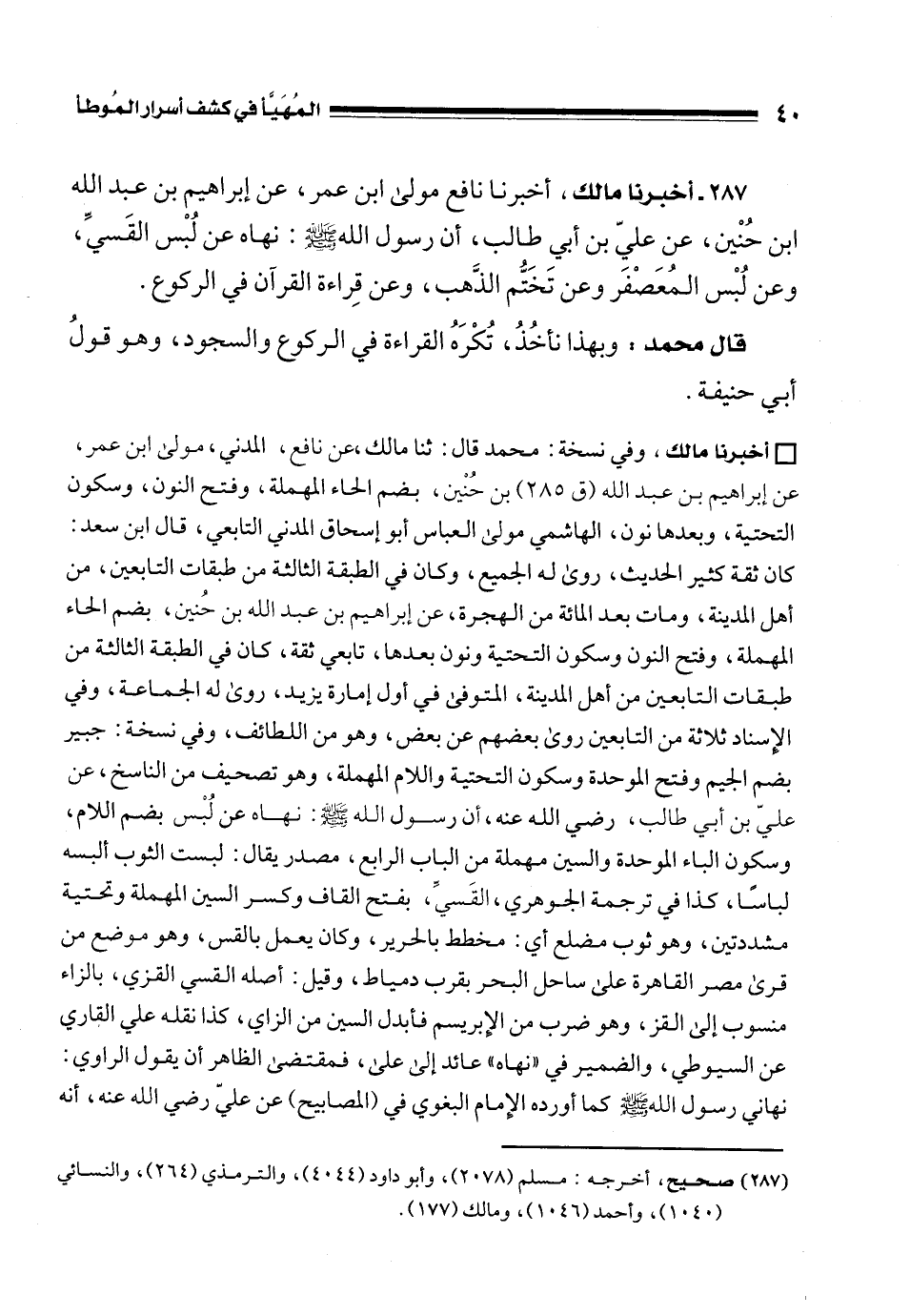 • أخبرنا مالك، وفي نسخة: محمد قال: ثنا مالك، عن نافع، المدني، مولى ابن عمر، عن إبراهيم بن عبد الله (ق 285) بن حُنين، بضم الحاء المهملة، وفتح النون، وسكون التحتية، وبعدها نون، الهاشمي مولى العباس أبو إسحاق المدني التابعي، قال ابن سعد: كان ثقة كثير الحديث، روى له الجميع، وكان في الطبقة الثالثة من طبقات التابعين، من أهل المدينة، ومات بعد المائة من الهجرة، عن إبراهيم بن عبد الله بن حُنين، بضم الحاء المهملة، وفتح النون وسكون التحتية ونون بعدها، تابعي ثقة، كان في الطبقة الثالثة من طبقات التابعين من أهل المدينة، المتوفى في أول إمارة يزيد، روى له الجماعة، وفي الإِسناد ثلاثة من التابعين روى بعضهم عن بعض، وهو من اللطائف، وفي نسخة: جبير بضم الجيم وفتح الموحدة وسكون التحتية واللام المهملة، وهو تصحيف من الناسخ، عن عليّ بن أبي طالب، رضي الله عنه، أن رسول الله - صلى الله عليه وسلم -: نهاه عن لُبْس بضم اللام، وسكون الباء الموحدة والسين مهملة من الباب الرابع، مصدر يقال: لبست الثوب ألبسه لباسًا، كذا في ترجمة الجوهري، القَسيِّ، بفتح القاف وكسر السين المهملة وتحتية مشددتين، وهو ثوب مضلع أي: مخطط بالحرير، وكان يعمل بالقس، وهو موضع من قرى مصر القاهرة على ساحل البحر بقرب دمياط، وقيل: أصله القسي القزي، بالزاء منسوب إلى القز، وهو ضرب من الإِبريسم فأبدل السين من الزاي، كذا نقله علي القاري عن السيوطي، والضمير في "نهاه" عائد إلى على، فمقتضى الظاهر أن يقول الراوي: نهاني رسول الله - صلى الله عليه وسلم - كما أورده الإِمام البغوي في (المصابيح) عن عليّ رضي الله عنه، أنه