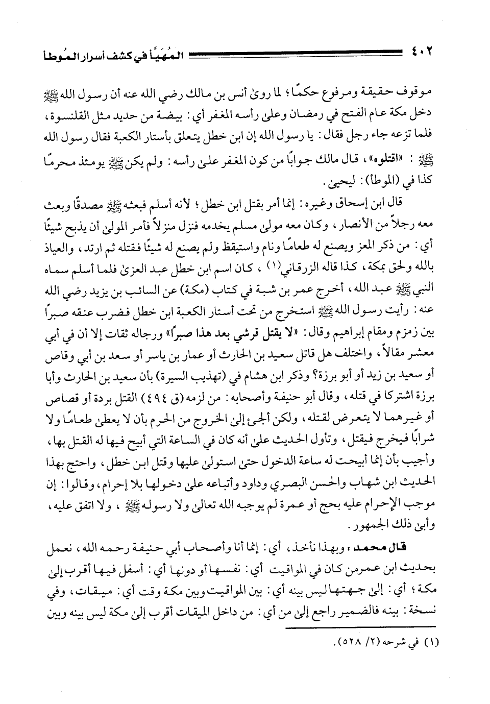 موقوف حقيقة ومرفوع حكمًا؛ لما روى أنس بن مالك رضي الله عنه أن رسول الله - صلى الله عليه وسلم - دخل مكة عام الفتح في رمضان وعلى رأسه المغفر أي: بيضة من حديد مثل القلنسوة، فلما نزعه جاء رجل فقال: يا رسول الله إن ابن خطل يتعلق بأستار الكعبة فقال رسول الله - صلى الله عليه وسلم -: "اقتلوه", قال مالك جوابًا من كون المغفر على رأسه: ولم يكن - صلى الله عليه وسلم - يومئذ محرمًا كذا في (الموطأ): ليحيى.