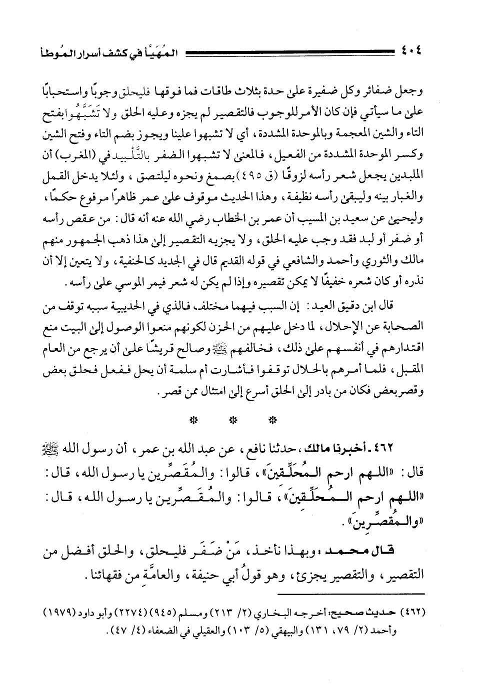 462 - أخبرنا مالك، حدثنا نافع، عن عبد الله بن عمر، أن رسول الله - صلى الله عليه وسلم - قال: "اللهم ارحم المُحَلِّقِينَ"، قالوا: والمُقَصِّرين يا رسول الله، قال: "اللهم ارحم المُحَلِّقِينَ"، قالوا: والمُقَصِّرين يا رسول الله، قال: "والمُقصِّرِينَ".
