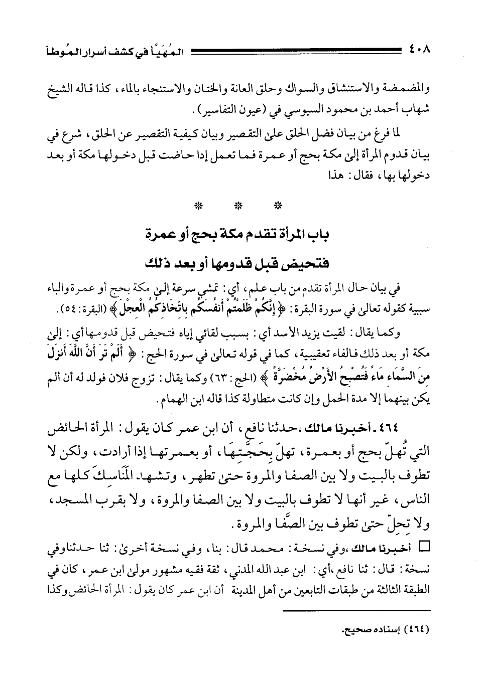 464 - أخبرنا مالك، حدثنا نافع، أن ابن عمر كان يقول: المرأة الحائض التي تُهلّ بحج أو بعمرة، تهلّ بِحَجَّتِهَا، أو بعمرتها إذا أرادت، ولكن لا تطوف بالبيت ولا بين الصفا والمروة حتى تطهر، وتشهد المَنَاسِكَ كلها مع الناس، غير أنها لا تطوف بالبيت ولا بين الصفا والمروة، ولا بقرب المسجد، ولا تِحِلّ حتى تطوف بين الصَّفا والمروة.