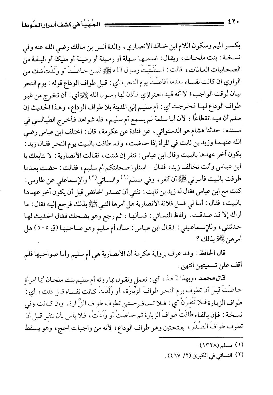 بكسر الميم وسكون اللام ابن خالد الأنصاري، والدة أنس بن مالك رضي الله عنه وفي نسخة: بنت ملحات، ويقال: اسمها سهلة أو رميلة أو رمينة أو مليكة أو اليفة من الصحابيات العالمات، قالت: استَفْتَيْتُ رسول الله - صلى الله عليه وسلم - فيمن حاضَتْ أو وَلَدَتْ شك من الراوي إن كانت نفساء بعد ما أفاضت يوم النحر, أي: قبل طواف الوداع قوله: يوم النحر بيان لوقت الواجب؛ لا أنه قيد احترازي فأذن لها رسول الله - صلى الله عليه وسلم - أي: أن تخرج من غير طواف الوداع لها فخرجت أي: أم سليم إلى المدينة بلا طواف الوداع، وهذا الحديث إن سلم أن فيه انقطاعًا؛ لأن أبا سلمة لم يسمع أم سليم، فله شواهد فأخرج الطيالسي في مسنده: حدثنا هشام هو الدستوائي، عن قتادة عن عكرمة، قال: اختلف ابن عباس رضي الله عنهما وزيد بن ثابت في المرأة إذا حاضت، وقد طافت بالبيت يوم النحر فقال زيد: يكون آخر عهدها بالبيت وقال ابن عباس: تنفر إن شئت، فقالت الأنصارية: لا نتابعك يا ابن عباس وأنت تخالف زيد، فقال: اسئلوا صحابتكم أم سليم، فقالت: حضت بعد ما طوفت بالبيت فأمرني - صلى الله عليه وسلم - أن أنفر، وفي مسلم (¬1) والنسائي (¬2) والإِسماعيلي عن طاوس: كنت مع ابن عباس فقال له زيد بن ثابت: تفتي أن تصدر الحائض قبل أن يكون آخر عهدها بالبيت، فقال: أما لي فسل فلانة الأنصارية هل أمرها النبي - صلى الله عليه وسلم - بذلك فرجع إليه فقال: ما أراك إلا قد صدقت. ولفظ النسائي: فسألها، ثم رجع وهو يضحك فقال الحديث لها حدثتني، وللإِسماعيلي: فقال ابن عباس: سأل أم سليم وهو صاحبها (ق 505) هل أمرهن - صلى الله عليه وسلم - بذلك؟