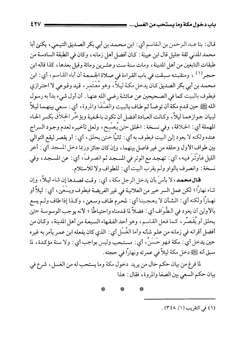 قال محمد: لا بأسَ بأن يدخل الرجل مكة، أي: وقت قصدها إن شاء ليلًا، وإن شاء نهارًا؛ لكن عمل السر خير من العلانية في غير الفريضة فيطوف ويسْعَى، أي: ليلًا أو نهارًا ولكنه أي: الشأن لا يعجبنا أي: لمحرم طاف وسعى، وكذا إذا طاف ولم يسع بالأولى أن يعود في الطَّوَاف أي: فضلًا لما قدمناه واحتياطًا؛ لأنه يوجب الوسوسة حتى يحلق أو يُقَصِّر، كما فعل القاسم، وهو أحد الفقهاء السبعة من أهل المدينة، وكان من أفضل أقرانه في زمانه من علو شأنه وأما الغُسْل أي: الذي كان يفعله ابن عمر يأمر به غيره حين يدخل أي: مكة فهو حَسَنٌ، أي: مستحب وليس بواجب أي: ولا سنة مؤكدة، لما سبق أنه - صلى الله عليه وسلم - دخل مكة ليلًا في عمرته ونهارًا في حجته.
