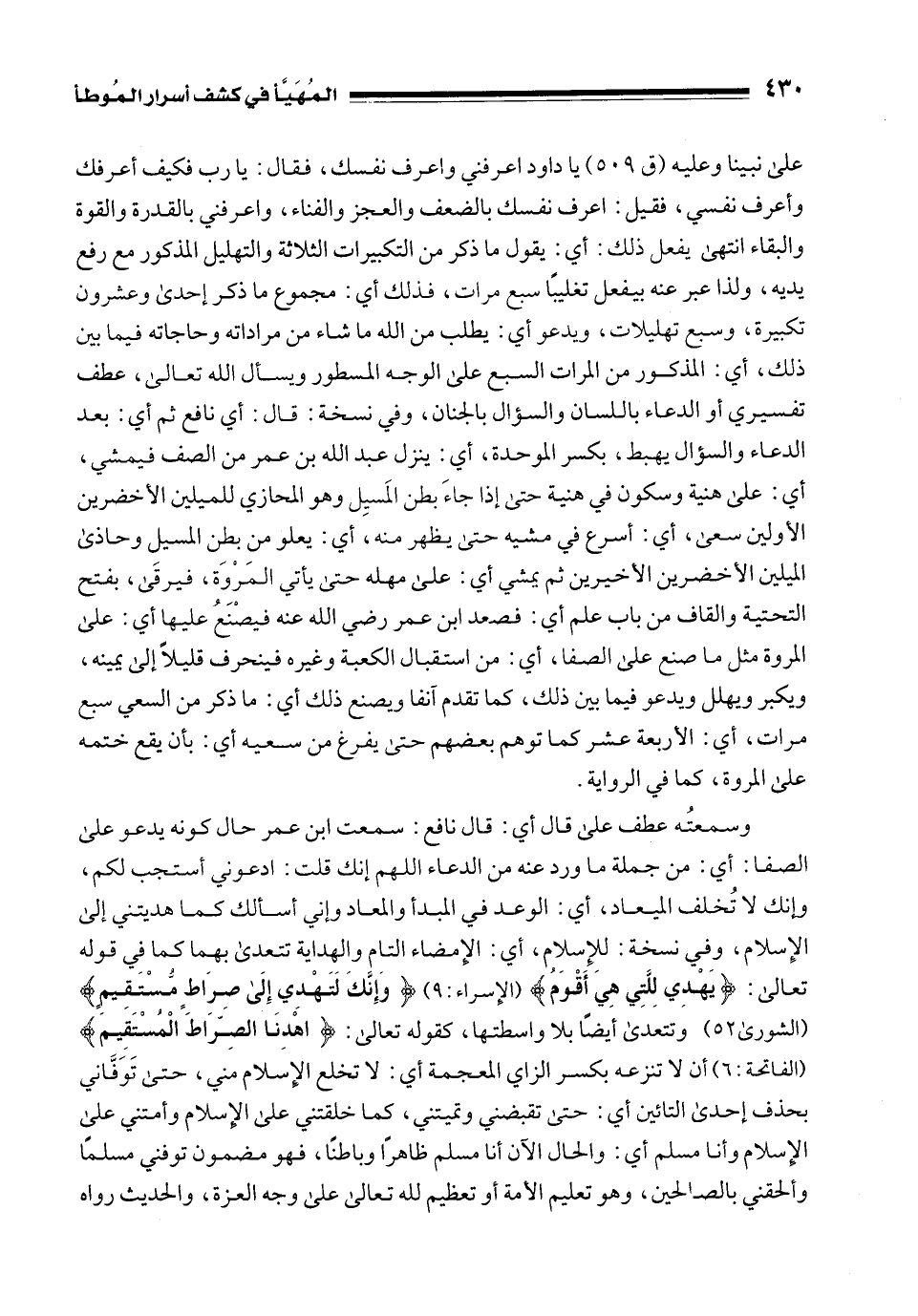 على نبينا وعليه (ق 509) يا داود اعرفني وأعرف نفسك، فقال: يا رب فكيف أعرفك وأعرف نفسي، فقيل: اعرف نفسك بالضعف والعجز والفناء، واعرفني بالقدرة والقوة والبقاء انتهى يفعل ذلك: أي: يقول ما ذكر من التكبيرات الثلاثة والتهليل المذكور مع رفع يديه، ولذا عبر عنه بيفعل تغليبًا سبع مرات، فذلك أي: مجموع ما ذكر إحدى وعشرون تكبيرة، وسبع تهليلات، ويدعو أي: يطلب من الله ما شاء من مراداته وحاجاته فيما بين ذلك، أي: المذكور من المرات السبع على الوجه المسطور ويسأل الله تعالى، عطف تفسيري أو الدعاء باللسان والسؤال بالجنان، وفي نسخة: قال: أي نافع ثم أي: بعد الدعاء والسؤال يهبط، بكسر الموحدة، أي: ينزل عبد الله بن عمر من الصف فيمشي، أي: على هنية وسكون في هنية حتى إذا جاءَ بطن المَسِيل وهو المحازي للميلين الأخضرين الأولين سعى، أي: أسرع في مشيه حتى يظهر منه، أي: يعلو من بطن المسيل وحاذى الميلين الأخضرين الأخيرين ثم يمشي أي: على مهله حتى يأتي المَرْوَة، فيرقَى، بفتح التحتية والقاف من باب علم أي: فصعد ابن عمر رضي الله عنه فيصْنَعُ عليها أي: على المروة مثل ما صنع على الصفا، أي: من استقبال الكعبة وغيره فينحرف قليلًا إلى يمينه، ويكبر ويهلل ويدعو فيما بين ذلك، كما تقدم آنفا ويصنع ذلك أي: ما ذكر من السعي سبع مرات، أي: الأربعة عشر كما توهم بعضهم حتى يفرغ من سعيه أي: بأن يقع ختمه على المروة، كما في الرواية.