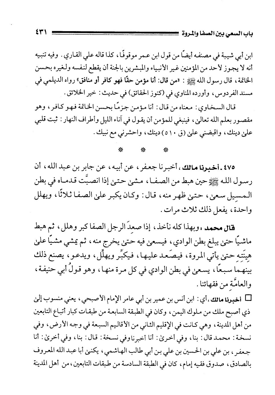 475 - أخبرنا مالك، أخبرنا جعفر، عن أبيه، عن جابر بن عبد الله، أن رسول الله - صلى الله عليه وسلم - حين هبط من الصفا، مشى حتى إذا انصبَّت قدماه في بطن المسِيل سعى، حتى ظهر منه، قال: وكان يكبر على الصفا ثلاثًا، ويهلل واحدة، يفعل ذلك ثلاث مرات.