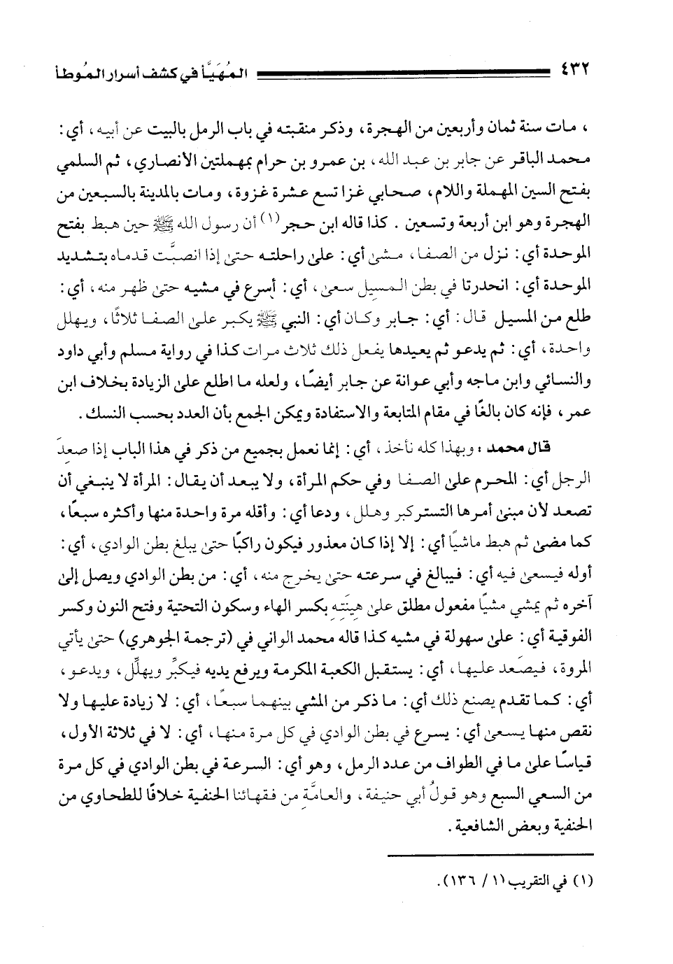 قال محمد: وبهذا كله نأخذ، أي: إنما نعمل بجميع من ذكر في هذا الباب إذا صعِدَ الرجل أي: المحرم على الصفا وفي حكم المرأة، ولا يبعد أن يقال: المرأة لا ينبغي أن تصعد لأن مبنى أمرها التستر كبر وهلل، ودعا أي: وأقله مرة واحدة منها وأكثره سبعًا، كما مضى ثم هبط ماشيًا أي: إلا إذا كان معذور فيكون راكبًا حتى يبلغ بطن الوادي، أي: أوله فيسعى فيه أي: فيبالغ في سرعته حتى يخرج منه، أي: من بطن الوادي ويصل إلى آخره ثم يمشي مشيًا مفعول مطلق على هِينَتِهِ بكسر الهاء وسكون التحتية وفتح النون وكسر الفوقية أي: على سهولة في مشيه كذا قاله محمد الواني في (ترجمة الجوهري) حتى يأتي المروة، فيصعَد عليها، أي: يستقبل الكعبة المكرمة ويرفع يديه فيكبِّر ويهلِّل، ويدعو، أي: كما تقدم يصنع ذلك أي: ما ذكر من المشي بينهما سبعًا، أي: لا زيادة عليها ولا نقص منها يسعى أي: يسرع في بطن الوادي في كل مرة منها، أي: لا في ثلاثة الأول، قياسًا على ما في الطواف من عدد الرمل، وهو أي: السرعة في بطن الوادي في كل مرة من السعي السبع وهو قولُ أبي حنيفة، والعامَّةِ من فقهائنا الحنفية خلافًا للطحاوي من الحنفية وبعض الشافعية.