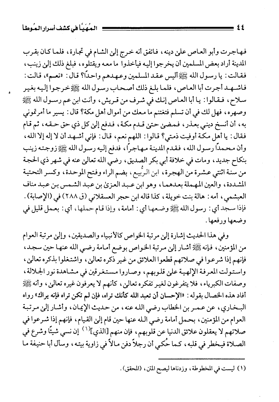 فهاجرت وأبو العاص على دينه، فاتفق أنه خرج إلى الشام في تجارة، فلما كان بقرب المدينة أراد بعض المسلمين أن يخرجوا إليه فيأخذوا ما معه ويقتلوه، فبلغ ذلك إلى زينب، فقالت: يا رسول الله - صلى الله عليه وسلم - أليس عقد المسلمين وعهدهم واحدًا؟ قال: "نعم"، قالت: فاشهد أجرت أبا العاص، فلما بلغ ذلك أصحاب رسول الله - صلى الله عليه وسلم - خرجوا إليه بغير سلاح، فقالوا: يا أبا العاص إنك في شرف من قريش، وأنت ابن عم رسول الله - صلى الله عليه وسلم - وصهره، فهل لك في أن تسلم فتغتنم ما معك من أموال أهل مكة؟ قال: يسير ما أمرتموني به، أن أنسخ ديني بعذر، فمضى حتى قدم مكة، فدفع إلى كل ذي حق حقه، ثم قام فقال: يا أهل مكة أوفيت ذمتي؟ قالوا: اللهم نعم، قال: فإني أشهد أن لا إله إلا الله، وأن محمدًا رسول الله، فقدم المدينة مهاجرًا، فدفع إليه رسول الله - صلى الله عليه وسلم - زوجته زينب بنكاح جديد، ومات في خلافة أبي بكر الصديق، رضي الله تعالى عنه في شهر ذي الحجة من سنة اثنتي عشرة من الهجرة، ابن الرُّبيع، بضم الراء وفتح الموحدة، وكسر التحتية المشددة، والعين المهملة بعدهما، وهو ابن عبد العزى بن عبد الشمس بن عبد مناف العبشمي، أمه: هالة بنت خويلة، كذا قاله ابن حجر العسقلاني (ق 288) في (الإِصابة). فإذا سجد أي: رسول الله - صلى الله عليه وسلم - وضعها أي: أمامة، وإذا قام حملها، أي: بعمل قليل في وضعها ورفعها.
