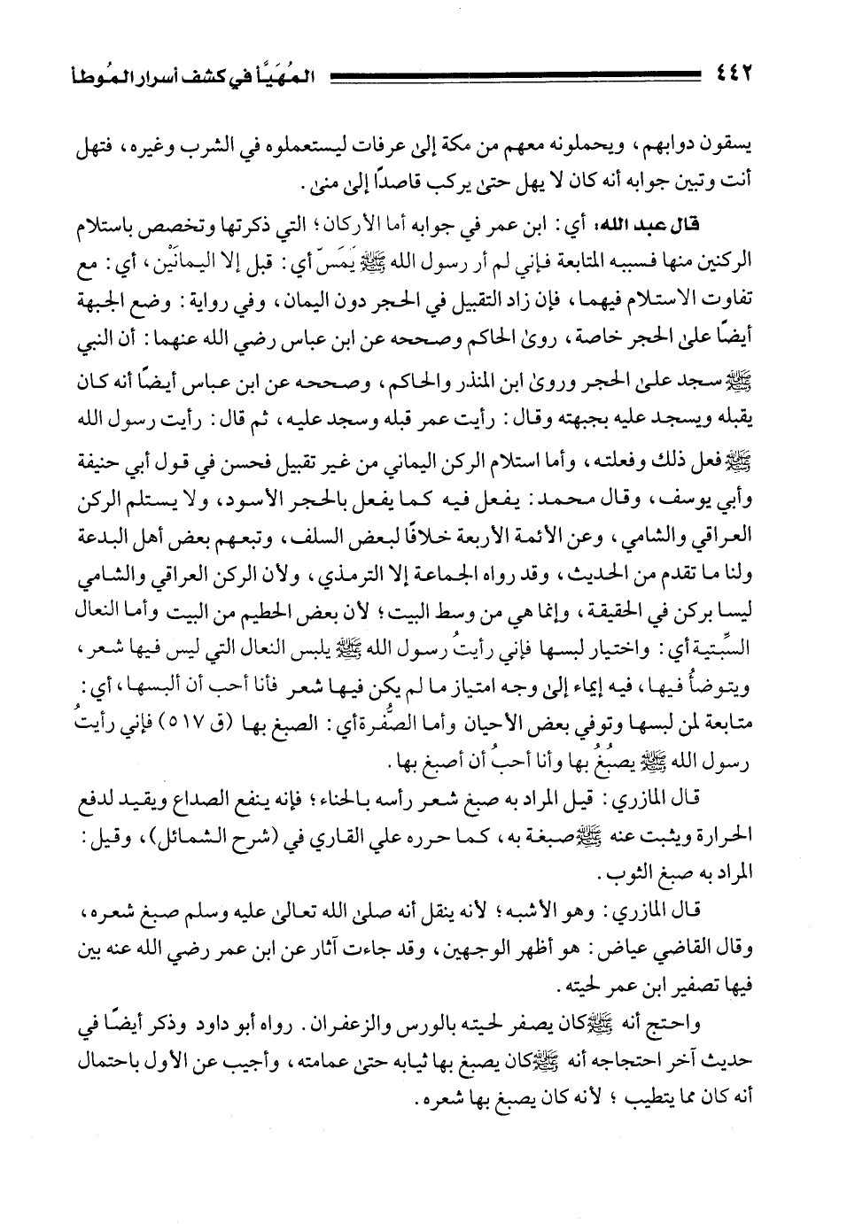 قال عبد الله: أي: ابن عمر في جوابه أما الأركان؛ التي ذكرتها وتخصص باستلام الركنين منها فسببه المتابعة فإني لم أر رسول الله - صلى الله عليه وسلم - يَمَسّ أي: قبل إلا اليمانَيْن، أي: مع تفاوت الاستلام فيهما، فإن زاد التقبيل في الحجر دون اليمان، وفي رواية: وضع الجبهة أيضًا على الحجر خاصة، روى الحاكم وصححه عن ابن عباس رضي الله عنهما: أن النبي - صلى الله عليه وسلم - سجد على الحجر وروى ابن المنذر والحاكم، وصححه عن ابن عباس أيضًا أنه كان يقبله ويسجد عليه بجبهته وقال: رأيت عمر قبله وسجد عليه، ثم قال: رأيت رسول الله - صلى الله عليه وسلم - فعل ذلك وفعلته، وأما استلام الركن اليماني من غير تقبيل فحسن في قول أبي حنيفة وأبي يوسف، وقال محمد: يفعل فيه كما يفعل بالحجر الأسود، ولا يستلم الركن العراقي والشامي، وعن الأئمة الأربعة خلافًا لبعض السلف، وتبعهم بعض أهل البدعة ولنا ما تقدم من الحديث، وقد رواه الجماعة إلا الترمذي، ولأن الركن العراقي والشامي ليسا بركن في الحقيقة، وإنما هي من وسط البيت؛ لأن بعض الحطيم من البيت وأما النعال السِّبتية أي: واختيار لبسها فإني رأيتُ رسول الله - صلى الله عليه وسلم - يلبس النعال التي ليس فيها شعر، ويتوضأُ فيها، فيه إيماء إلى وجه امتياز ما لم يكن فيها شعر فأنا أحب أن ألبسها، أي: متابعة لمن لبسها وتوفي بعض الأحيان، وأما الصُّفرة أي: الصبغ بها (ق 517) فإني رأيتُ رسول الله - صلى الله عليه وسلم - يصبُغُ بها وأنا أحبُ أن أصبغ بها.
