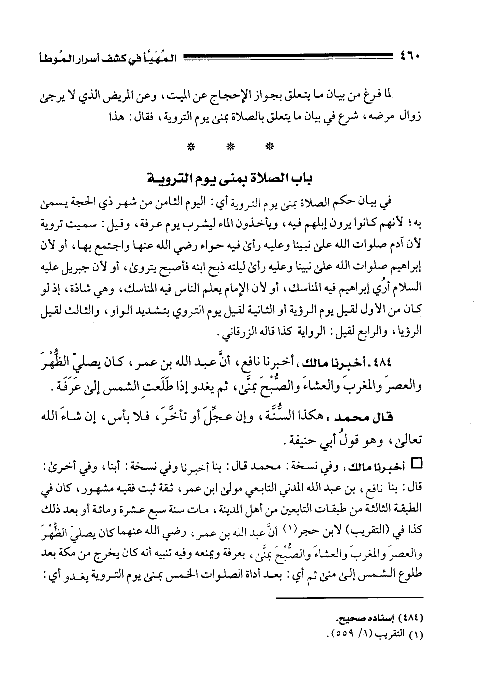 484 - أخبرنا مالك، أخبرنا نافع، أنَّ عبد الله بن عمر، كان يصليّ الظُّهْرَ والعصرَ والمغربَ والعشاءَ والصُّبْحَ بمنَّى، ثم يغدو إذا طَلَعتِ الشمس إلى عَرَفَة.