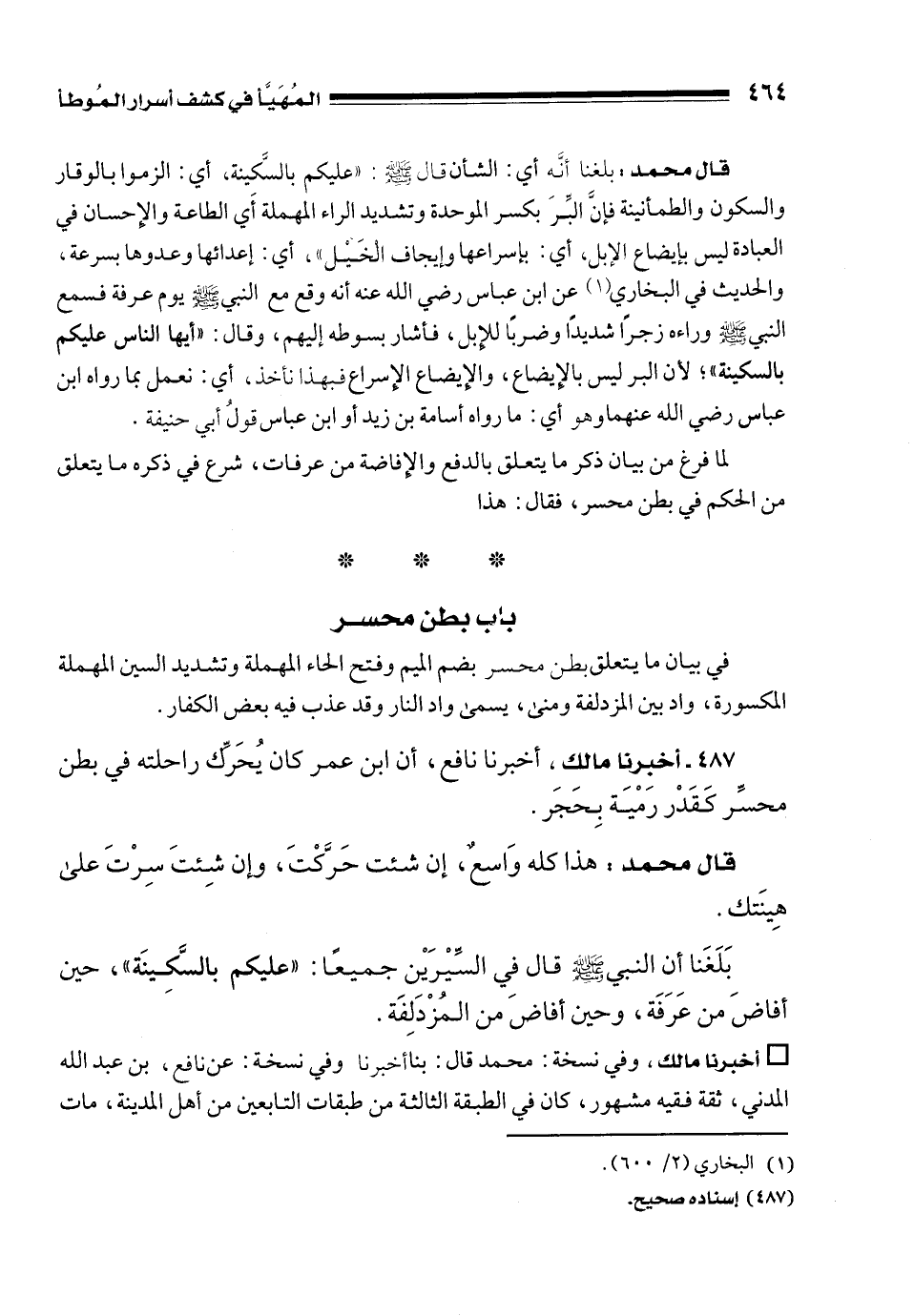 487 - أخبرنا مالك، أخبرنا نافع، أن ابن عمر كان يُحَرِّك راحلته في بطن محسِّر كَقَدْر رَمْيَة بِحَجَر.