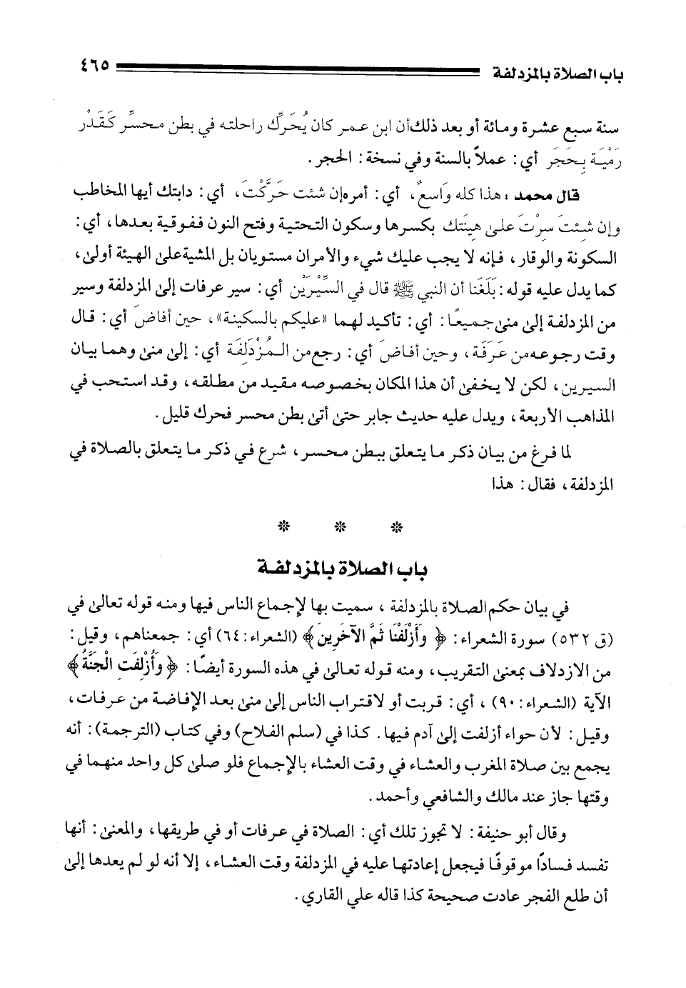 في بيان حكم الصلاة بالمزدلفة، سميت بها لإِجماع الناس فيها ومنه قوله تعالى في (ق 532) سورة الشعراء: {وَأَزْلَفْنَا ثَمَّ الْآخَرِينَ} [الشعراء: 64] أي: جمعناهم، وقيل: من الازدلاف بمعنى التقريب، ومنه قوله تعالى في هذه السورة أيضًا: {وَأُزْلِفَتِ الْجَنَّةُ} الآية [الشعراء: 90]، أي: قربت أو لاقتراب الناس إلى منى بعد الإِفاضة من عرفات، وقيل: لأن حواء أزلفت إلى آدم فيها. كذا في (سلم الفلاح) وفي كتاب (الترجمة): أنه يجمع بين صلاة المغرب والعشاء في وقت العشاء بالإِجماع فلو صلى كل واحد منهما في وقتها جاز عند مالك والشافعي وأحمد.