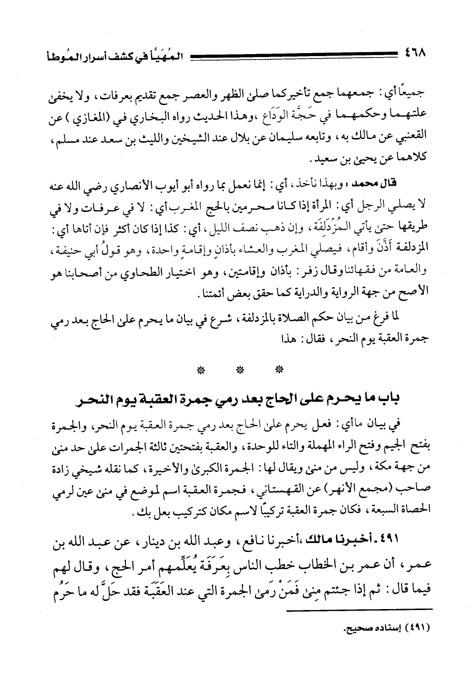 491 - أخبرنا مالك، أخبرنا نافع، وعبد الله بن دينار، عن عبد الله بن عمر، أن عمر بن الخطاب خطب الناس بِعَرَفَة يُعَلِّمهم أمر الحج، وقال لهم فيما قال: ثم إذا جئتم مِنى فَمَنْ رَمى الجمرة التي عند العَقَبَة فقد حَلَّ له ما حَرُم