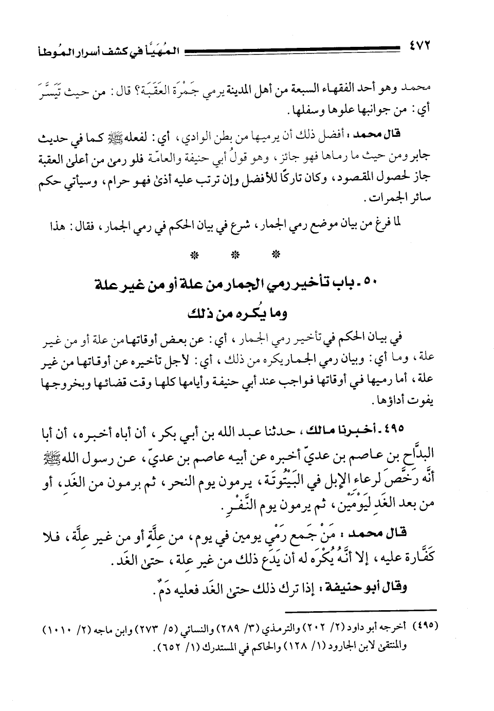 495 - أخبرنا مالك، حدثنا عبد الله بن أبي بكر، أن أباه أخبره، أن أبا البدَّاح بنِ عاصم بن عديّ أخبره عن أبيه عاصم بن عديّ، عن رسول الله - صلى الله عليه وسلم - أنَّه رَخَّص لرعاءِ الإِبل في البَيْتُوتَة، يرمون يوم النحر، ثم يرمون من الغَدِ، أو من بعد الغَدِ لِيَوْمَيْن، ثم يرمون يوم النَّفْرِ.