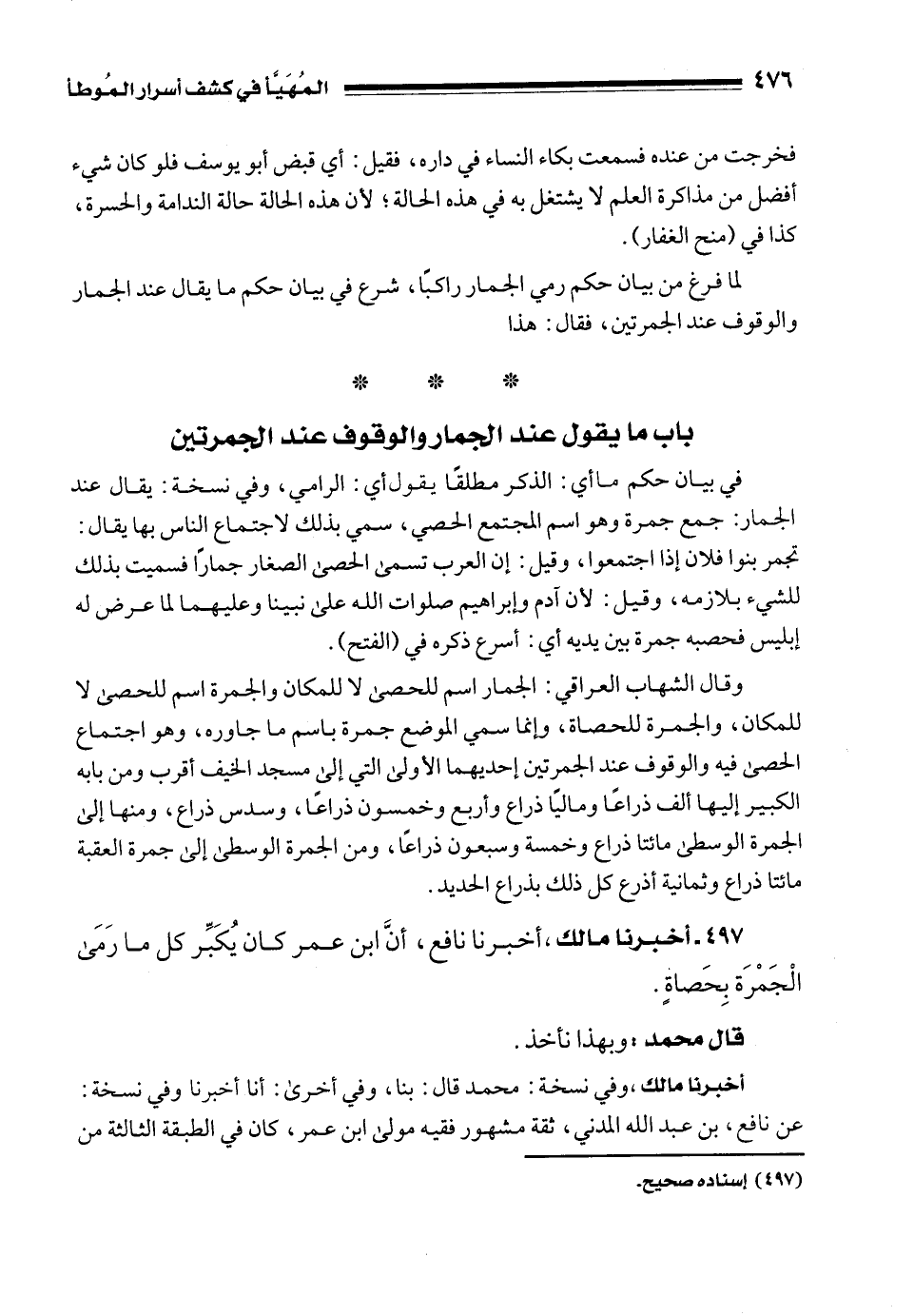 497 - أخبرنا مالك، أخبرنا نافع، أنَّ ابن عمر كان يُكَبِّر كل ما رَمَى الْجَمْرَة بِحَصاةٍ.