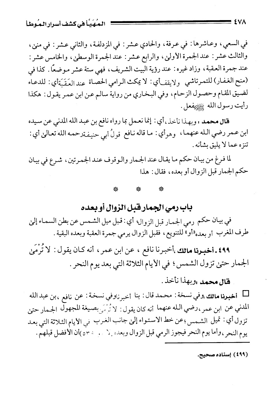 • أخبرنا مالك، وفي نسخة: محمد قال: بنا أخبرنا وفي نسخة: عن نافع، بن عبد الله المدني عن ابن عمر، رضي الله عنهما أنه كان يقول: لا تُرْمي بصيغة المجهول الجمار حتى تزول أي: تميل الشمس؛ عن خط الاستواء إلى جانب الغرب في الأيام الثلاثة التي بعد يوم النحر، وأما يوم النحر فيجوز الرمي قبل الزوال وبعده إلا (ق 539) أن الأفضل قبلهم.