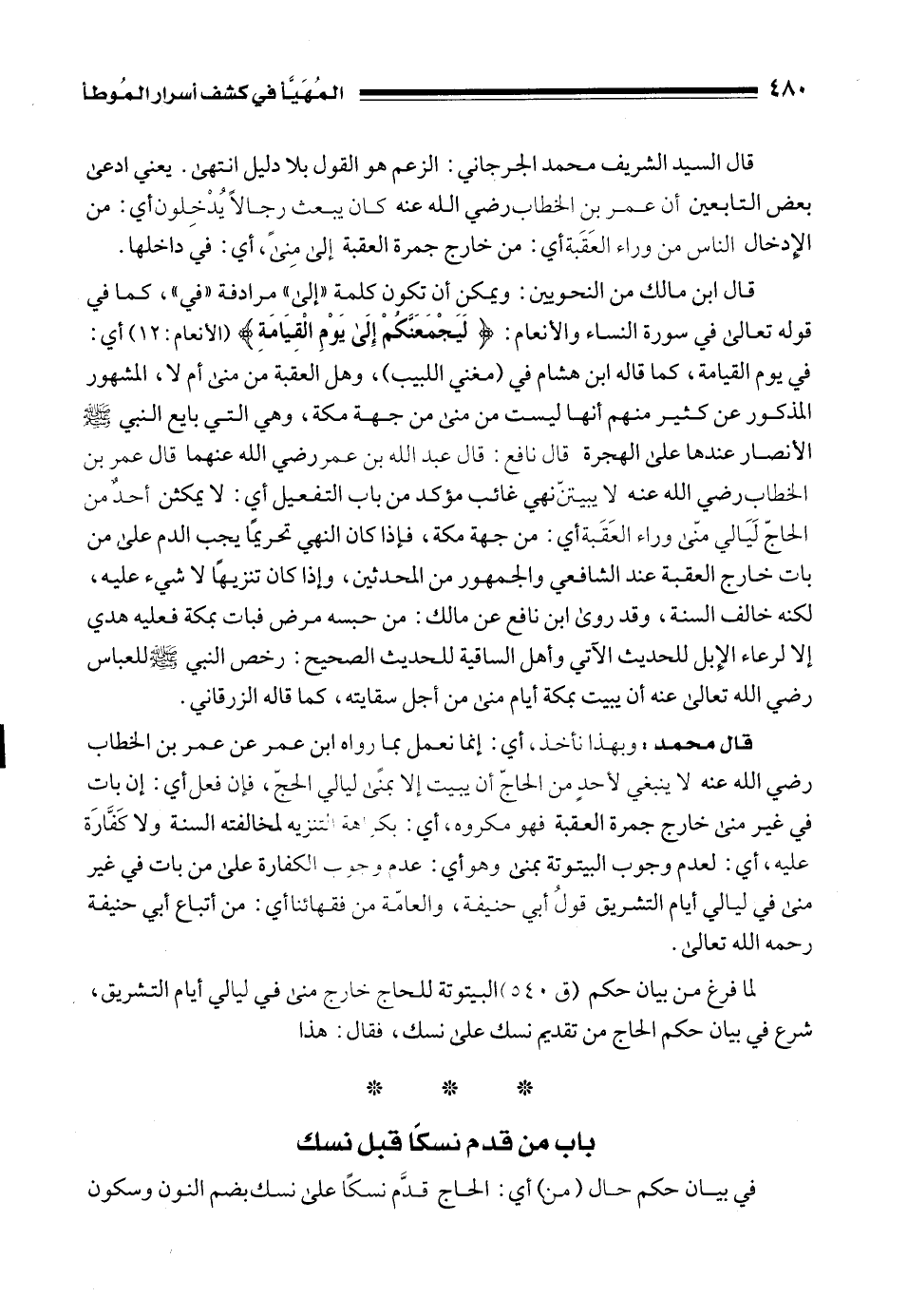 قال محمد: وبهذا نأخذ، أي: إنما نعمل بما رواه ابن عمر عن عمر بن الخطاب رضي الله عنه لا ينبغي لأحدٍ من الحاجّ أن يبيت إلا بمنًى ليالي الحجّ، فإن فعل أي: إن بات في غير منى خارج جمرة العقبة فهو مكروه، أي: بكراهة التنزيه لمخالفته السنة ولا كَفَّارَة عليه، أي: لعدم وجوب البيتوتة بمنى وهو أي: عدم وجوب الكفارة على من بات في غير منى في ليالي أيام التشريق قولُ أبي حنيفة، والعامّة من فقهائنا أي: من أتباع أبي حنيفة رحمه الله تعالى.