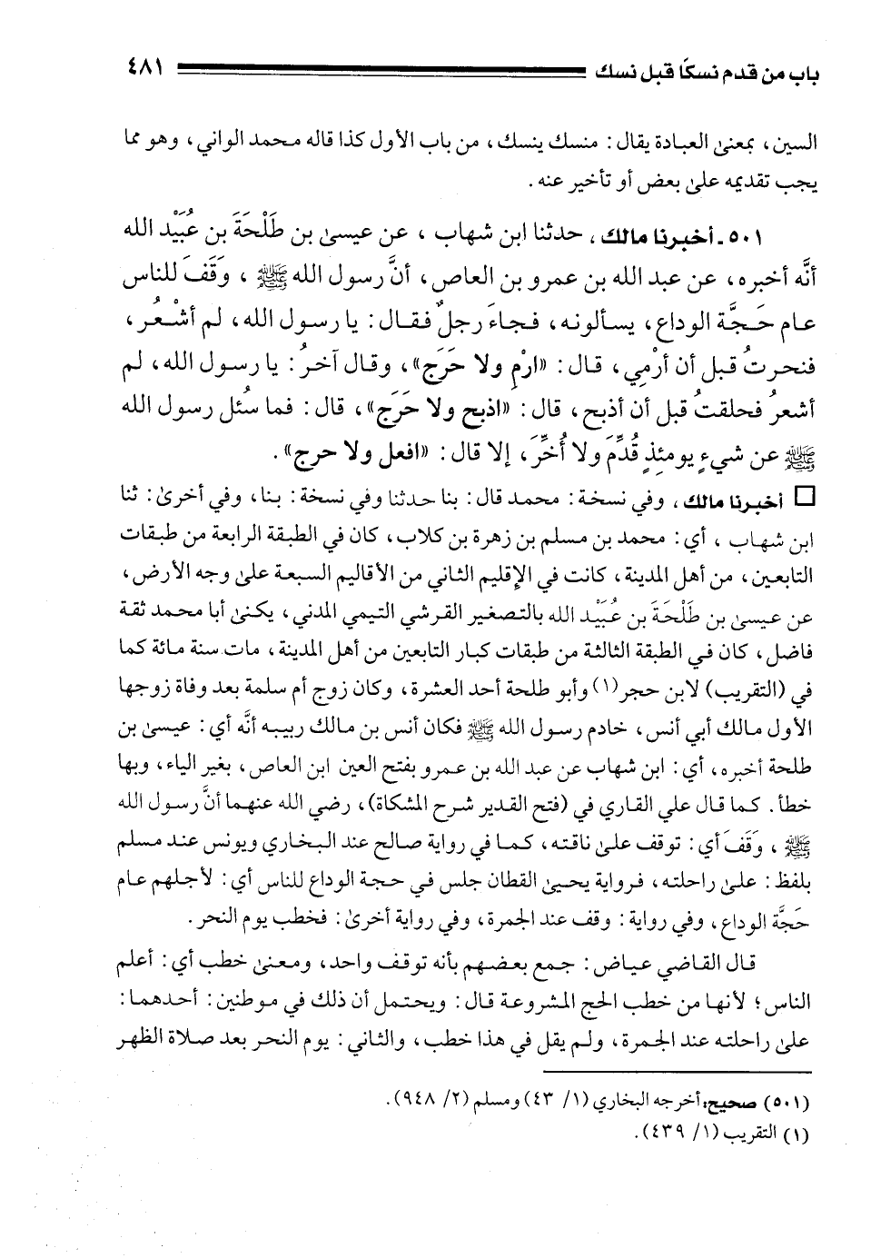 501 - أخبرنا مالك، حدثنا ابن شهاب، عن عيسى بن طَلْحَةَ بن عُبَيْد الله أنَّه أخبره، عن عبد الله بن عمرو بن العاص، أنَّ رسول الله - صلى الله عليه وسلم -، وَقَفَ للناس عام حَجَّة الوداع، يسألونه، فجاءَ رجلٌ فقال: يا رسول الله، لم أشْعُر، فنحرتُ قبل أن أرْمِي، قال: "ارْمِ ولا حَرَج"، وقال آخرُ: يا رسول الله، لم أشعرُ فحلقتُ قبل أن أذبح، قال: "اذبح ولا حَرَج"، قال: فما سُئل رسول الله - صلى الله عليه وسلم - عن شيءٍ يومئِذٍ قُدِّمَ ولا أُخِّرَ، إلا قال: "افعل ولا حرج".