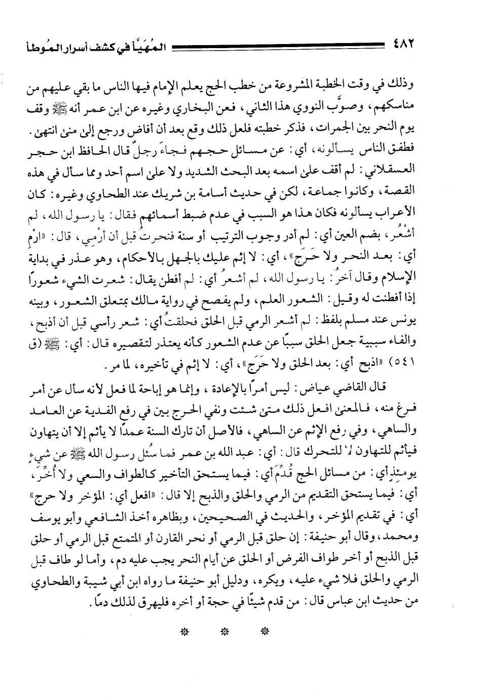 قال القاضي عياض: ليس أمرًا بالإعادة، وإنما هو إباحة لما فعل لأنه سأل عن أمر فرغ منه، فالمعنى افعل ذلك متى شئت ونفي الحرج بين في رفع الفدية عن العامد والساهي، وفي مسائل الإِثم عن الساهي، فالأصل أن تارك السنة عمدًا لا يأثم إلا أن يتهاون فيأثم للتهاون لا للتحرك قال: أي: عبد الله بن عمر فما سُئل رسول الله - صلى الله عليه وسلم - عن شيءٍ يومئِذٍ أي: من مسائل الحج قُدِّمَ أي: فيما يستحق التأخير كالطواف والسعي ولا أُخِّرَ، أي: فيما يستحق التقديم من الرمي والحلق والذبح إلا قال: "افعل أي: المؤخر ولا حرج" أي: في تقديم المؤخر، والحديث في الصحيحين، وبظاهره أخذ الشافعي وأبو يوسف ومحمد، وقال أبو حنيفة: إن حلق قبل الرمي أو نحر القارن أو المتمتع قبل الرمي أو حلق قبل الذبح أو أخر طواف الفرض أو الحلق عن أيام النحر يجب عليه دم، وأما لو طاف قبل الرمي والحلق فلا شيء عليه، ويكره، ودليل أبو حنيفة ما رواه ابن أبي شيبة والطحاوي من حديث ابن عباس قال: من قدم شيئًا في حجة أو أخره فليهرق لذلك دمًا.