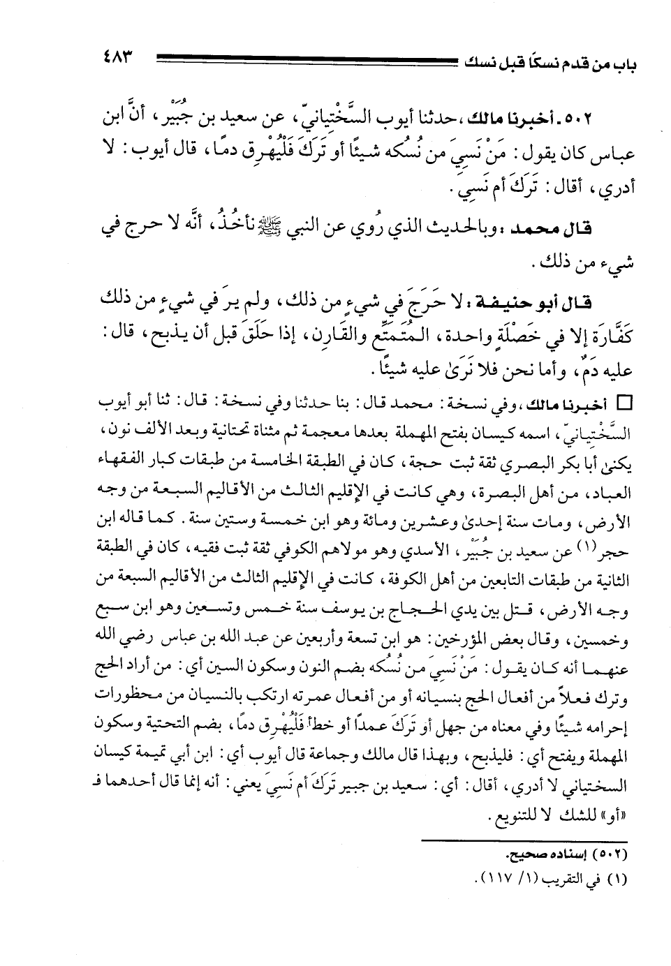 502 - أخبرنا مالك، حدثنا أيوب السَّخْتِيانِيّ، عن سعيد بن جُبَيْر، أنَّ ابن عباس كان يقول: مَنْ نَسِيَ من نُسُكه شيئًا أو تَركَ فَلْيُهْرِق دمًا، قال أيوب: لا أدري، أقال: تَرَكَ أم نَسِيَ.