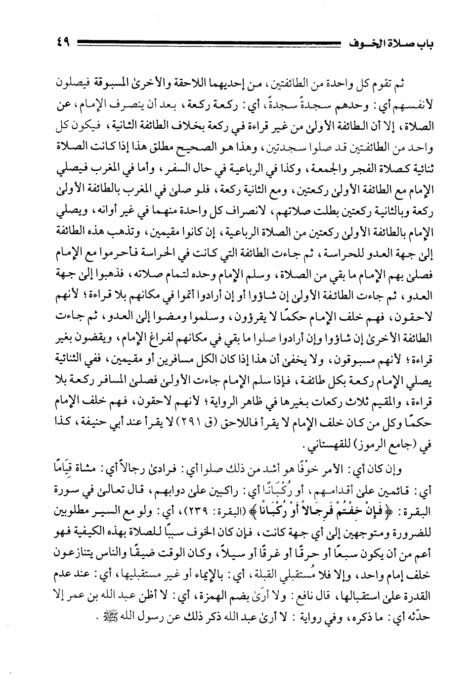 ثم تقوم كل واحدة من الطائفتين، من إحديهما اللاحقة والأخرى المسبوقة فيصلون لأنفسهم أي: وحدهم سجدةً سجدةً، أي: ركعة ركعة، بعد أن ينصرف الإِمام، عن الصلاة، إلا أن الطائفة الأولى من غير قراءة في ركعة بخلاف الطائفة الثانية، فيكون كل واحد من الطائفتين قد صلوا سجدتين، وهذا هو الصحيح مطلق هذا إذا كانت الصلاة ثنائية كصلاة الفجر والجمعة، وكذا في الرباعية في حال السفر، وأما في المغرب فيصلي الإِمام مع الطائفة الأولى ركعتين، ومع الثانية ركعة، فلو صلى في المغرب بالطائفة الأولى ركعة وبالثانية ركعتين بطلت صلاتهم، لانصراف كل واحدة منهما في غير أوانه، ويصلي الإِمام بالطائفة الأولى ركعتين من الصلاة الرباعية، إن كانوا مقيمين، وتذهب هذه الطائفة إلى جهة العدو للحراسة، ثم جاءت الطائفة التي كانت في الحراسة فأحرموا مع الإِمام فصلى بهم الإِمام ما بقي من الصلاة، وسلم الإِمام وحده لتمام صلاته، فذهبوا إلى جهة العدو، ثم جاءت الطائفة الأولى إن شاؤوا أو إن أرادوا أتموا في مكانهم بلا قراءة؛ لأنهم لاحقون، فهم خلف الإِمام حكمًا لا يقرؤون، وسلموا ومضوا إلى العدو، ثم جاءت الطائفة الأخرى إن شاؤوا وإن أرادوا صلوا ما بقي في مكانهم لفراغ الإِمام، ويقضون بغير قراءة؛ لأنهم مسبوقون، ولا يخفى أن هذا إذا كان الكل مسافرين أو مقيمين، ففي الثنائية يصلي الإِمام ركعة بكل طائفة، فإذا سلم الإِمام جاءت الأولى فصلى المسافر ركعة بلا قراءة، والمقيم ثلاث ركعات بغيرها في ظاهر الرواية؛ لأنهم لاحقون، فهم خلف الإِمام حكمًا وكل من كان خلف الإِمام لا يقرأ فاللاحق (ق 291) لا يقرأ عند أبي حنيفة، كذا في (جامع الرموز) للقهستاني.