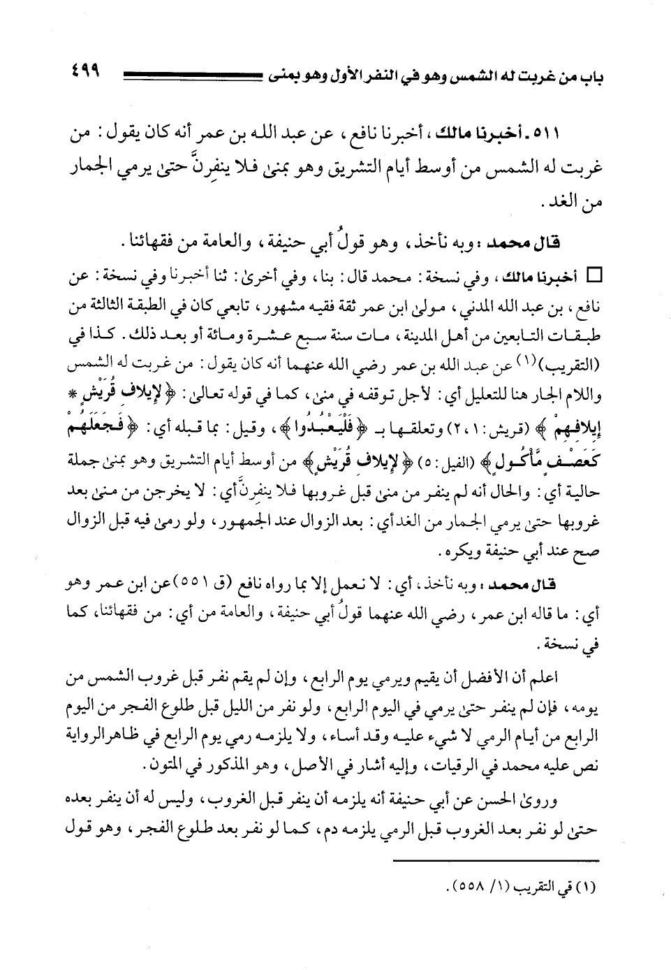 • أخبرنا مالك، وفي نسخة: محمد قال: بنا، وفي أخرى: ثنا أخبرنا وفي نسخة: عن نافع، بن عبد الله المدني، مولى ابن عمر ثقة فقيه مشهور، تابعي كان في الطبقة الثالثة من طبقات التابعين من أهل المدينة، مات سنة سبع عشرة ومائة أو بعد ذلك. كذا في (التقريب) (¬1) عن عبد الله بن عمر رضي الله عنهما أنه كان يقول: من غربت له الشمس واللام الجار هنا للتعليل أي: لأجل توقفه في منى، كما في قوله تعالى: {لِإِيلَافِ قُرَيْشٍ (1) إِيلَافِهِمْ} [قريش: 1, 2] وتعلقها بـ {فَلْيَعْبُدُوا}، وقيل: بما قبله أي: {فَجَعَلَهُمْ كَعَصْفٍ مَأْكُولٍ} [الفيل: 5] {لِإِيلَافِ قُرَيْشٍ} من أوسط أيام التشريق وهو بمنى جملة حالية أي: والحال أنه لم ينفر من منى قبل غروبها فلا ينفِرنَّ أي: لا يخرجن من منى بعد غروبها حتى يرمي الجمار من الغد أي: بعد الزوال عند الجمهور، ولو رمى فيه قبل الزوال صح عند أبي حنيفة ويكره.