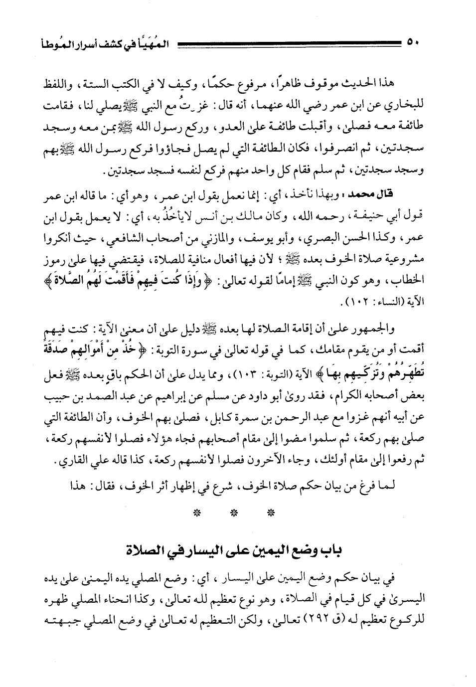 قال محمد: وبهذا نأخذ، أي: إنما نعمل بقول ابن عمر، وهو أي: ما قاله ابن عمر قول أبي حنيفة، رحمه الله، وكان مالك بن أنس لا يأخُذُ به، أي: لا يعمل بقول ابن عمر، وكذا الحسن البصري، وأبو يوسف، والمازني من أصحاب الشافعي، حيث أنكروا مشروعية صلاة الخوف بعده - صلى الله عليه وسلم -؛ لأن فيها أفعال منافية للصلاة، فيقتضي فيها على رموز الخطاب، وهو كون النبي - صلى الله عليه وسلم - إمامًا لقوله تعالى: {وَإِذَا كُنْتَ فِيهِمْ فَأَقَمْتَ لَهُمُ الصَّلَاةَ} الآية [النساء: 102].