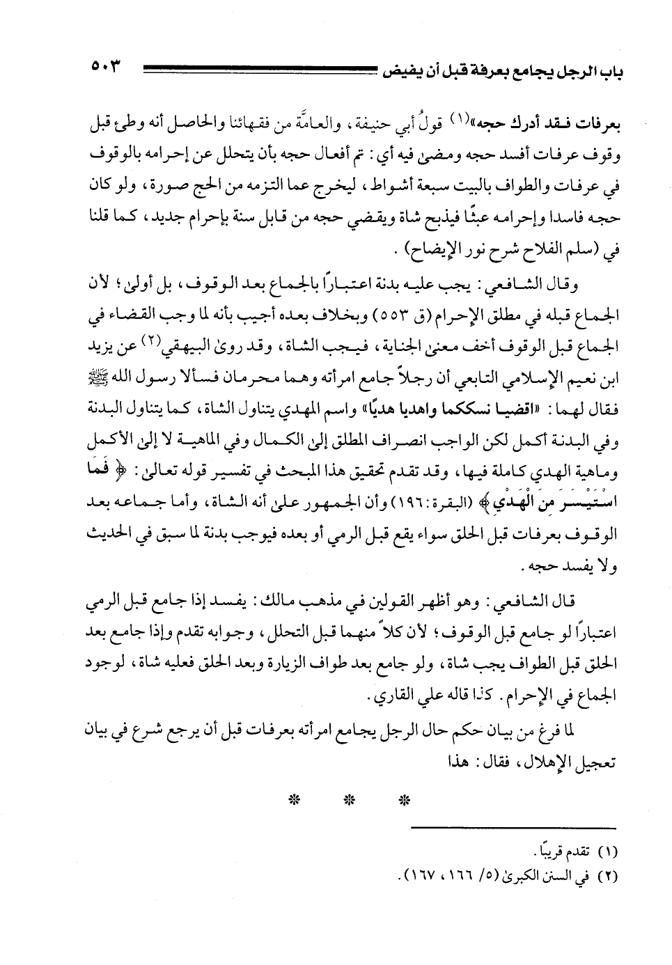 وقال الشافعي: يجب عليه بدنة اعتبارًا بالجماع بعد الوقوف، بل أولى؛ لأن الجماع قبله في مطلق الإِحرام (ق 553) وبخلاف بعده أجيب بأنه لما وجب القضاء في الجماع قبل الوقوف أخف معنى الجناية، فيجب الشاة، وقد روى البيهقي (¬2) عن يزيد بن نعيم الإِسلامي التابعي أن رجلًا جامع امرأته وهما محرمان فسألا رسول الله - صلى الله عليه وسلم - فقال لهما: "اقضيا نسككما واهديا هديًا" واسم المهدي يتناول الشاة، كما يتناول البدنة وفي البدنة أكمل لكن الواجب انصراف المطلق إلى الكمال وفي الماهية لا إلى الأكمل وماهية الهدي كاملة فيها، وقد تقدم تحقيق هذا المبحث في تفسير قوله تعالى: {فَمَا اسْتَيْسَرَ مِنَ الْهَدْيِ} [البقرة: 196] وأن الجمهور على أنه الشاة، وأما جماعه بعد الوقوف بعرفات قبل الحلق سواء يقع قبل الرمي أو بعده فيوجب بدنة لما سبق في الحديث ولا يفسد حجه.