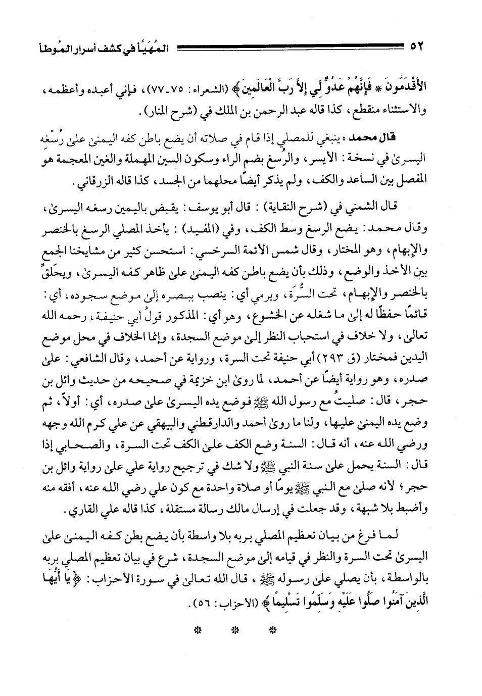 قال الشمني في (شرح النقاية): قال أبو يوسف: يقبض باليمين رسغه اليسرى، وقال محمد: يضع الرسغ وسط الكف، وفي (المفيد): يأخذ المصلي الرسغ بالخنصر والإِبهام، وهو المختار، وقال شمس الأئمة السرخسي: استحسن كثير من مشايخنا الجمع بين الأخذ والوضع، وذلك بأن يضع باطن كفه اليمنى على ظاهر كفه اليسرى، ويحَلِّق بالخنصر والإِبهام، تحت السُّرَة، ويرمي أي: ينصب ببصره إلى موضع سجوده، أي: قائمًا حفظًا له إلى ما شغله عن الخشوع، وهو أي: المذكور قولُ أبي حنيفة، رحمه الله تعالى، ولا خلاف في استحباب النظر إلى موضع السجدة، وإنما الخلاف في محل موضع اليدين فمختار (ق 293) أبي حنيفة تحت السرة، ورواية عن أحمد، وقال الشافعي: على صدره، وهو رواية أيضًا عن أحمد، لما روى ابن خزيمة في صحيحه من حديث وائل بن حجر، قال: صليتُ مع رسول الله - صلى الله عليه وسلم - فوضع يده اليسرى على صدره، أي: أولًا، ثم وضع يده اليمنى عليها، ولنا ما روى أحمد والدارقطني والبيهقي عن علي كرم الله وجهه ورضي الله عنه، أنه قال: السنة وضع الكف على الكف تحت السرة، والصحابي إذا قال: السنة يحمل على سنة النبي - صلى الله عليه وسلم - ولا شك في ترجيح رواية علي على رواية وائل بن حجر؛ لأنه صلى مع النبي - صلى الله عليه وسلم - يومًا أو صلاة واحدة مع كون علي رضي الله عنه، أفقه منه وأضبط بلا شبهة، وقد جعلت في إرسال مالك رسالة مستقلة، كذا قاله علي القاري.