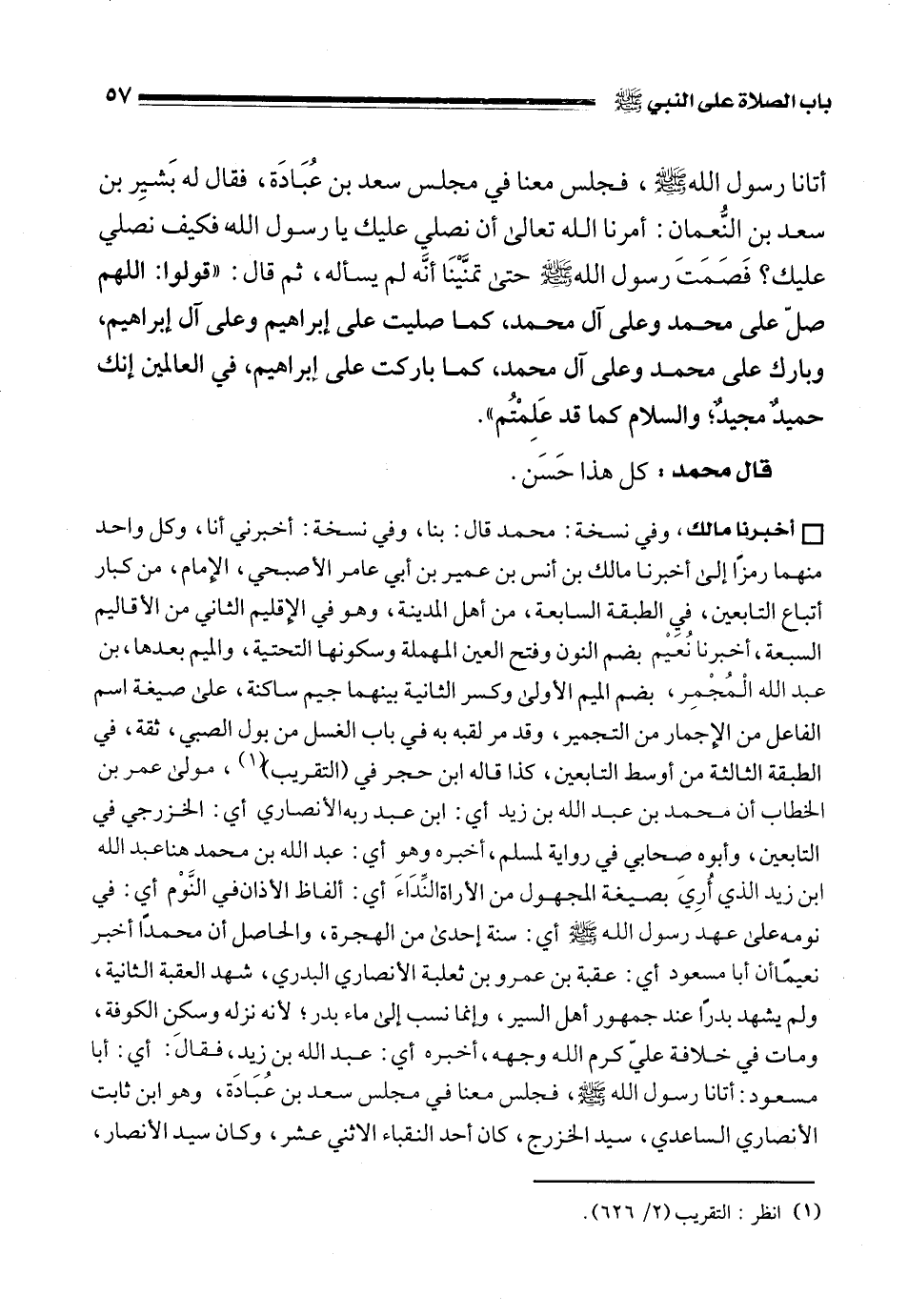أتانا رسول الله - صلى الله عليه وسلم -، فجلس معنا في مجلس سعد بن عُبَادَة، فقال له بَشِير بن سعد بن النُّعمان: أمرنا الله تعالى أن نصلي عليك يا رسول الله فكيف نصلي عليك؟ فَصَمَتَ رسول الله - صلى الله عليه وسلم - حتى تمنَّيْنَا أنَّه لم يسأله، ثم قال: "قولوا: اللهم صلّ على محمد وعلى آل محمد، كما صليت على إبراهيم وعلى آل إبراهيم، وبارك على محمد وعلى آل محمد، كما باركت على إبراهيم، في العالمين إنك حميدٌ مجيدٌ؛ والسلام كما قد عَلِمْتُم".