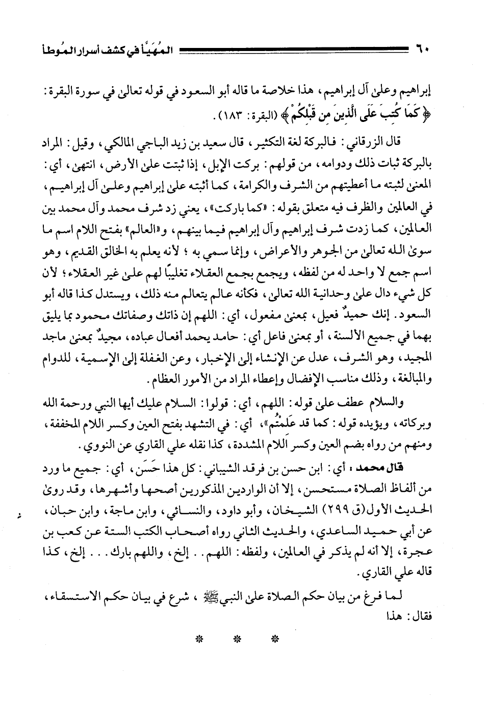 قال الزرقاني: فالبركة لغة التكثير، قال سعيد بن زيد الباجي المالكي، وقيل: المراد بالبركة ثبات ذلك ودوامه، من قولهم: بركت الإِبل، إذا ثبتت على الأرض، انتهى، أي: المعنى لثبته ما أعطيتهم من الشرف والكرامة، كما أثبته على إبراهيم وعلى آل إبراهيم، في العالمين والظرف فيه متعلق بقوله: "كما باركت"، يعني زد شرف محمد وآل محمد بين العالمين، كما زدت شرف إبراهيم وآل إبراهيم فيما بينهم، و"العالم" بفتح اللام اسم ما سوى الله تعالى من الجوهر والأعراض، وإنما سمي به؛ لأنه يعلم به الخالق القديم، وهو اسم جمع لا واحد له من لفظه، ويجمع بجمع العقلاء تغليبًا لهم على غير العقلاء؛ لأن كل شيء دال على وحدانية الله تعالى، فكأنه عالم يتعالم منه ذلك، ويستدل كذا قاله أبو السعود. إنك حميدٌ فعيل، بمعنى مفعول، أي: اللهم إن ذاتك وصفاتك محمود بما يليق بهما في جميع الألسنة، أو بمعنى فاعل أي: حامد يحمد أفعال عباده، مجيدٌ بمعنى ماجد المجيد، وهو الشرف، عدل عن الإِنشاء إلى الإِخبار، وعن الغفلة إلى الإِسمية، للدوام والمبالغة، وذلك مناسب الإِفضال وإعطاء المراد من الأمور العظام.