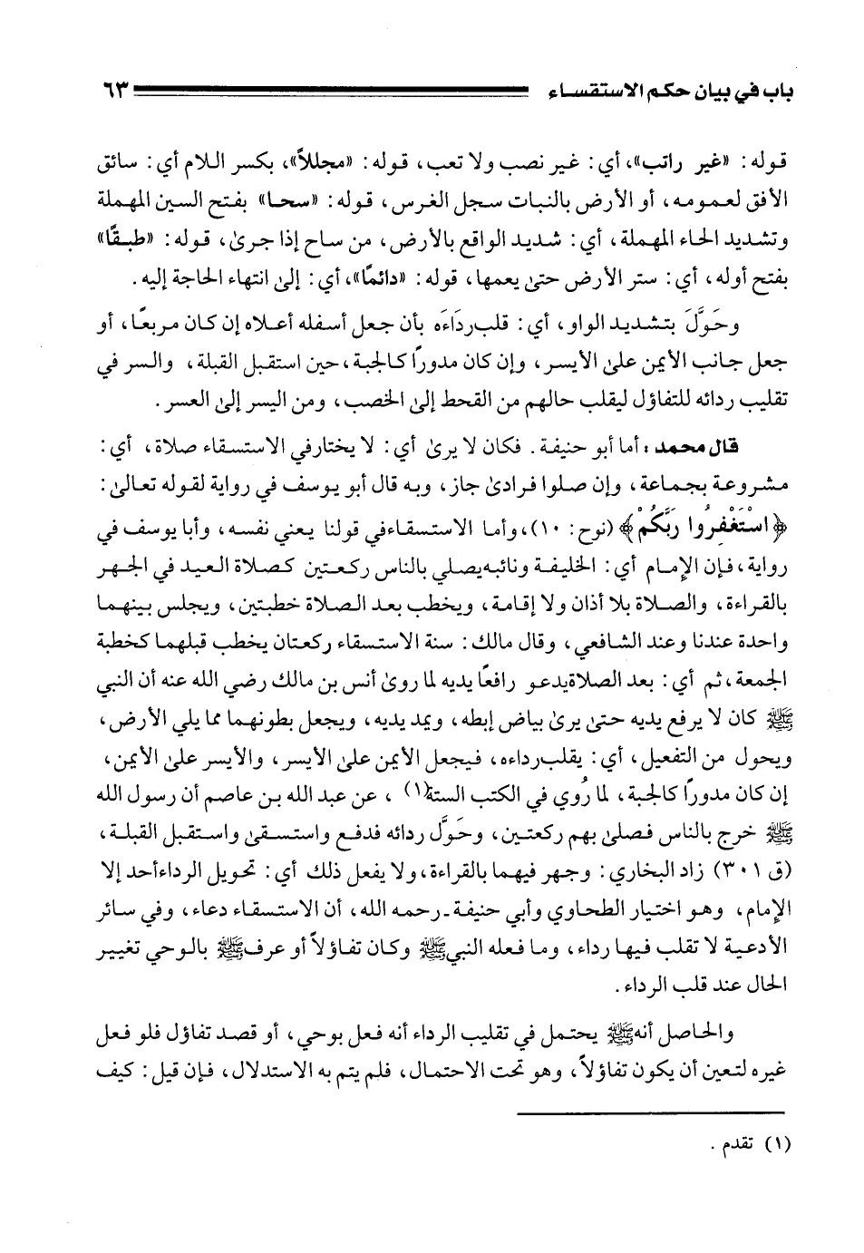 قال محمد: أما أبو حنيفة. فكان لا يرى أي: لا يختار في الاستسقاء صلاة، أي: مشروعة بجماعة، وإن صلوا فرادى جاز، وبه قال أبو يوسف في رواية لقوله تعالى: {اسْتَغْفِرُوا رَبَّكُمْ} [نوح: 10]، وأما الاستسقاء في قولنا يعني نفسه، وأبا يوسف في رواية، فإن الإِمام أي: الخليفة ونائبه يصلي بالناس ركعتين كصلاة العيد في الجهر بالقراءة، والصلاة بلا أذان ولا إقامة، ويخطب بعد الصلاة خطبتين، ويجلس بينهما واحدة عندنا وعند الشافعي، وقال مالك: سنة الاستسقاء ركعتان يخطب قبلهما كخطبة الجمعة، ثم أي: بعد الصلاة يدعو رافعًا يديه لا روى أنس بن مالك رضي الله عنه أن النبي - صلى الله عليه وسلم - كان لا يرفع يديه حتى يرى بياض إبطه، ويمد يديه، ويجعل بطونهما مما يلي الأرض، ويحول من التفعيل، أي: يقلب رداءه، فيجعل الأيمن على الأيسر، والأيسر على الأيمن، إن كان مدورًا كالجبة، لما رُوي في الكتب الستة (¬1)، عن عبد الله بن عاصم أن رسول الله - صلى الله عليه وسلم - خرج بالناس فصلى بهم ركعتين، وحَوَّل ردائه فدفع واستسقى واستقبل القبلة، (ق 301) زاد البخاري: وجهر فيهما بالقراءة، ولا يفعل ذلك أي: تحويل الرداء أحد إلا الإِمام، وهو اختيار الطحاوي وأبي حنيفة - رحمه الله، أن الاستسقاء دعاء، وفي سائر الأدعية لا تقلب فيها رداء، وما فعله النبي - صلى الله عليه وسلم - وكان تفاؤلًا أو عرف - صلى الله عليه وسلم - بالوحي تغيير الحال عند قلب الرداء.