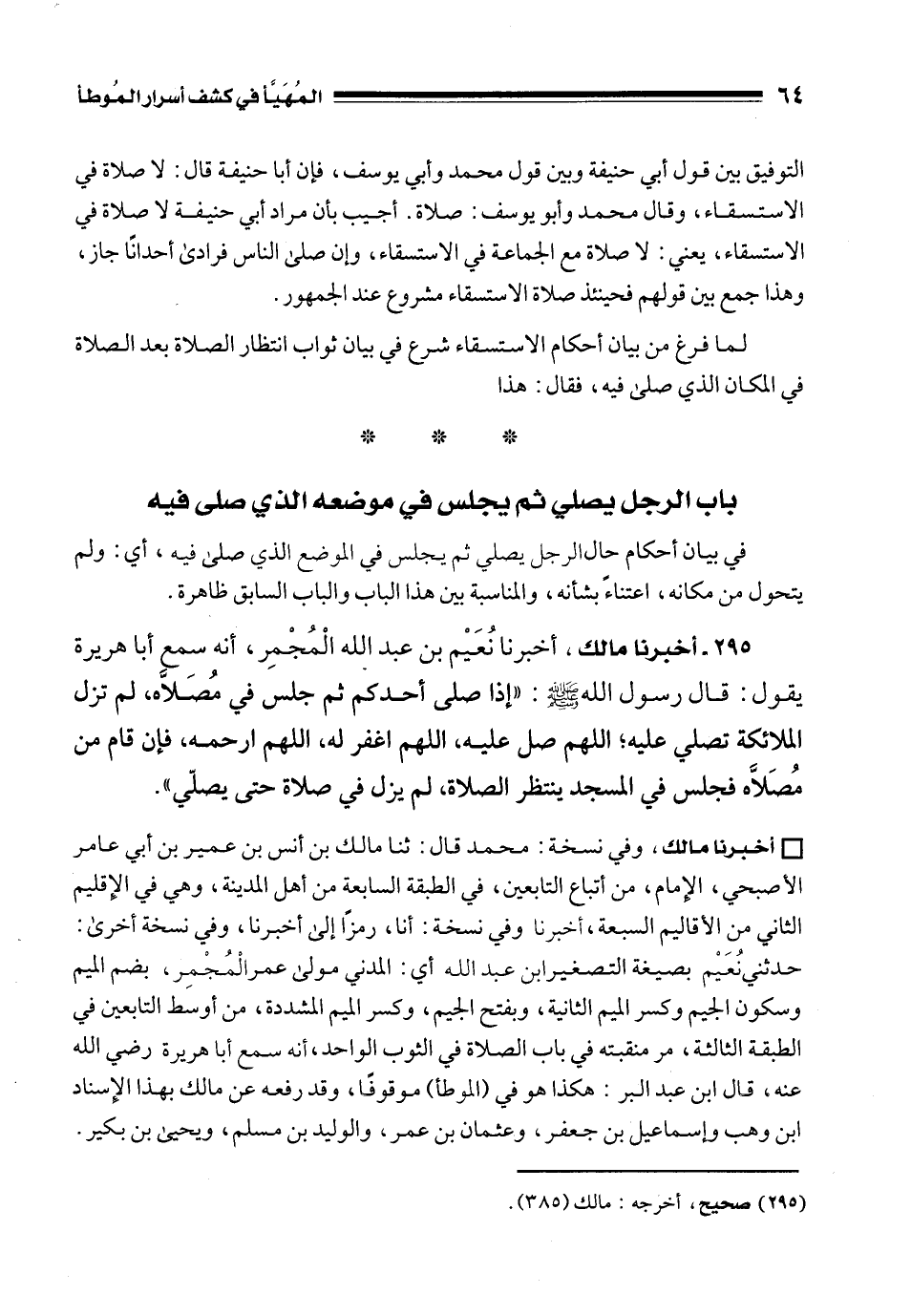 • أخبرنا مالك، وفي نسخة: محمد قال: ثنا مالك بن أنس بن عمير بن أبي عامر الأصبحي، الإِمام، من أتباع التابعين، في الطبقة السابعة من أهل المدينة، وهي في الإِقليم الثاني من الأقاليم السبعة، أخبرنا وفي نسخة: أنا، رمزًا إلى أخبرنا، وفي نسخة أخرى: حدثني نُعَيْم بصيغة التصغير ابن عبد الله أي: المدني مولى عمر الْمُجْمِر، بضم الميم وسكون الجيم وكسر الميم الثانية، وبفتح الجيم، وكسر الميم المشددة، من أوسط التابعين في الطبقة الثالثة، مر منقبته في باب الصلاة في الثوب الواحد، أنه سمع أبا هريرة رضي الله عنه, قال ابن عبد البر: هكذا هو في (الموطأ) موقوفًا، وقد رفعه عن مالك بهذا الإِسناد ابن وهب وإسماعيل بن جعفر، وعثمان بن عمر، والوليد بن مسلم، ويحيى بن بكير.