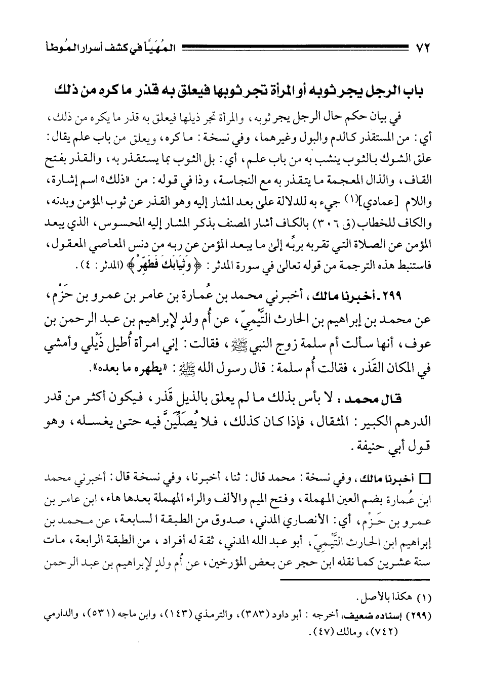 299 - أخبرنا مالك، أخبرني محمد بن عُمارة بن عامر بن عمرو بن حَزْم، عن محمد بن إبراهيم بن الحارث التَّيْمِيّ، عن أُم ولدٍ لإِبراهيم بن عبد الرحمن بن عوف، أنها سألت أم سلمة زوج النبي - صلى الله عليه وسلم -، فقالت: إني امرأة أُطيل ذَيْلي وأمشي في المكان القَذر، فقالت أُم سلمة: قال رسول الله - صلى الله عليه وسلم -: "يطهره ما بعده".
