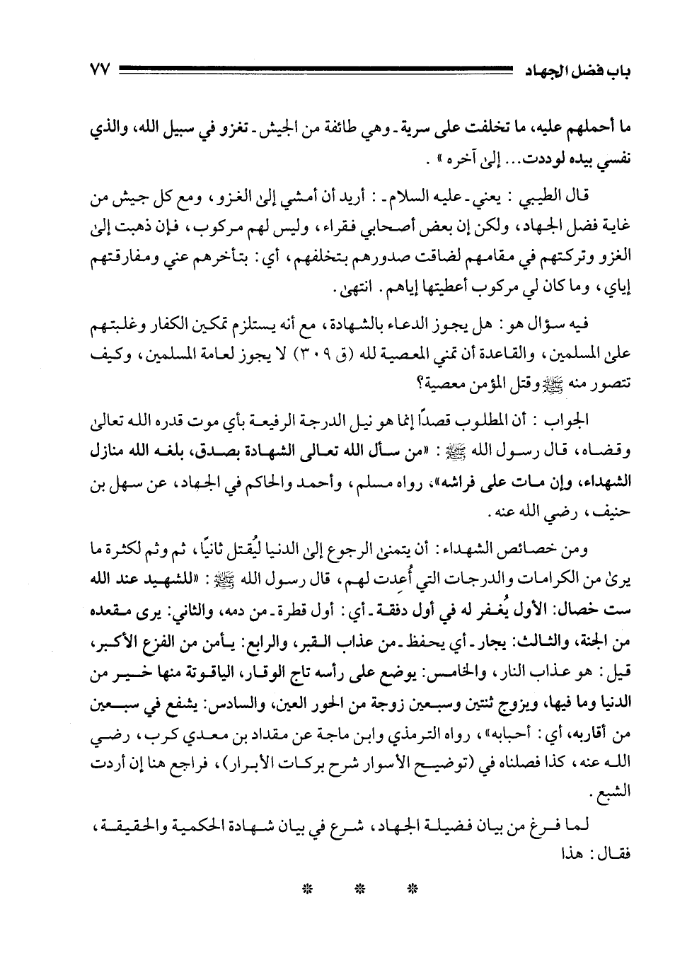 فيه سؤال هو: هل يجوز الدعاء بالشهادة، مع أنه يستلزم تمكين الكفار وغلبتهم على المسلمين، والقاعدة أن تمني المعصية لله (ق 309) لا يجوز لعامة المسلمين، وكيف تتصور منه - صلى الله عليه وسلم - وقتل المؤمن معصية؟