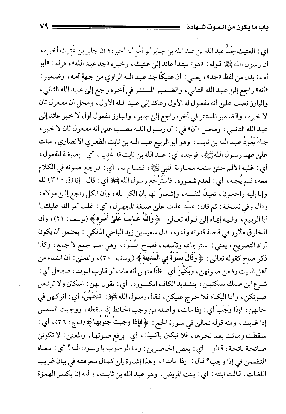أي: العتيك جَدُّ عبد الله بن عبد الله بن جابر أبو أمِّهِ أنه أخبره؛ أن جابر بن عَتِيك أخبره، أن رسول الله - صلى الله عليه وسلم - قوله: "هو" مبتدأ عائد إلى عتيك، وخبره "جد عبد الله"، قوله: "أبو أمه" بدل من لفظ "جد"، يعني: أن عتيكًا جد عبد الله الراوي من جهة أمه، وضمير: "أنه" راجع إلى عبد الله الثاني، والضمير المستتر في آخره راجع إلى عبد الله الثاني، والبارز نصب على أنه مفعول له الأول وعائد إلى عبد الله الأول، ومحل أن مفعول ثان لا خبره، والضمير المستتر في آخره راجع إلى جابر، والبارز مفعول أول لا خبر عائد إلى عبد الله الثاني، ومحل "أن" في: أن رسول الله نصب على أنه مفعول ثان لا خبر، جاءَ يَعُودُ عبد الله بن ثابت، وهو أبو الربيع عبد الله بن ثابت الظفري الأنصاري، مات على عهد رسول الله - صلى الله عليه وسلم -، فوجده أي: عبد الله بن ثابت قد غُلِبَ، أي: بصيغة المفعول، أي: غلبه الألم حتى منعه مجاوبة النبي - صلى الله عليه وسلم -، فصاح به، أي: فرجع صوته في الكلام معه، فلم يُجبه، أي: لعدم شعوره، فاسْتَرْجَع رسول الله - صلى الله عليه وسلم - أي: قال: إنا (ق 310) لله وإنا إليه راجعون، تعبدًا لنفسه، وإشعارًا لها بأن الكل لله، وأن الكل راجع إلى مولاه، وقال وفي نسخة: ثم قال: غُلِبْنا عليك على صيغة المجهول، أي: غلب أمر الله عليك يا أبا الربيع، وفيه إيماء إلى قوله تعالى: {وَاللَّهُ غَالِبٌ عَلَى أَمْرِهِ} [يوسف: 21]، وأن المخلوق مأثور في قبضة قدرته وقدره، قال سعيد بن زيد الباجي المالكي: يحتمل أن يكون أراد التصريح، يعني: استرجاعه وتأسفه، فصاح النِّسْوَة، وهي اسم جمع لا جمع، وكذا ذكر صاح كقوله تعالى: {وَقَالَ نِسْوَةٌ فِي الْمَدِينَةِ} [يوسف: 30]، والمعنى: أن النساء من أهل البيت رفعن صوتهن، وَبَكَيْنَ أي: ظنًا منهن أنه مات أو قارب الموت، فجعل أي: شرع ابن عتيك يسكتهن، بتشديد الكاف المكسورة، أي: يقول لهن: اسكتن ولا ترفعن صوتكن، وأما البكاء فلا حرج عليكن، فقال رسول الله - صلى الله عليه وسلم -: "دَعْهُنّ، أي: اتركهن في حالهن، فإذا وَجَبَ أي: إذا مات، وأصله من وجب الحائط إذا سقطه، ووجبت الشمس إذا غابت، ومنه قوله تعالى في سورة الحج: {فَإِذَا وَجَبَتْ جُنُوبُهَا} [الحج: 36]، أي: سقطت وماتت بعد نحرها، فلا تبكين باكية"، أي: برفع صوتها، والمعنى: لا تكونن صائحة نائحة، قالوا: أي: بعض الحاضرين: وما الوجوب يا رسول الله؟ أي: معناه المتضمن في إذا وجب؟ قال: "إذا مات"، وهذا إشارة إلى كمال معرفته في بيان غريب اللغات، قالت ابنته: أي: بنت المريض، وهو عبد الله بن ثابت، والله إن بكسر الهمزة