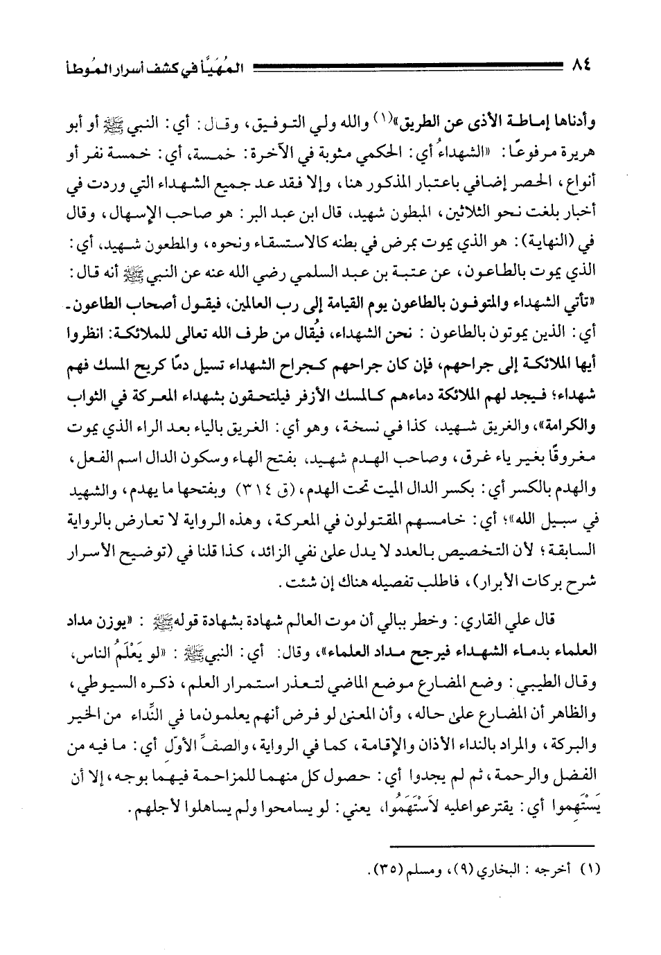 وأدناها إماطة الأذى عن الطريق" (¬1) والله ولي التوفيق، وقال: أي: النبي - صلى الله عليه وسلم - أو أبو هريرة مرفوعًا: "الشهداءُ أي: الحكمي مثوبة في الآخرة: خمسة، أي: خمسة نفر أو أنواع، الحصر إضافي باعتبار المذكور هنا، وإلا فقد عد جميع الشهداء التي وردت في أخبار بلغت نحو الثلاثين، المبطون شهيد، قال ابن عبد البر: هو صاحب الإِسهال، وقال في (النهاية): هو الذي يموت بمرض في بطنه كالاستسقاء ونحوه، والمطعون شهيد، أي: الذي يموت بالطاعون، عن عتبة بن عبد السلمي رضي الله عنه عن النبي - صلى الله عليه وسلم - أنه قال: "تأتي الشهداء والمتوفون بالطاعون يوم القيامة إلى رب العالمين، فيقول أصحاب الطاعون - أي: الذين يموتون بالطاعون: نحن الشهداء، فيُقال من طرف الله تعالى للملائكة: انظروا أيها الملائكة إلى جراحهم، فإن كان جراحهم كجراح الشهداء تسيل دمًا كريح المسك فهم شهداء؛ فيجد لهم الملائكة دماءهم كالمسك الأزفر فيلتحقون بشهداء المعركة في الثواب والكرامة"، والغريق شهيد، كذا في نسخة، وهو أي: الغريق بالياء بعد الراء الذي يموت مغروقًا بغير ياء غرق، وصاحب الهدم شهيد، بفتح الهاء وسكون الدال اسم الفعل، والهدم بالكسر أي: بكسر الدال الميت تحت الهدم، (ق 314) وبفتحها ما يهدم، والشهيد في سبيل الله"؛ أي: خامسهم المقتولون في المعركة، وهذه الرواية لا تعارض بالرواية السابقة؛ لأن التخصيص بالعدد لا يدل على نفي الزائد، كذا قلنا في (توضيح الأسرار شرح بركات الأبرار)، فاطلب تفصيله هناك إن شئت.