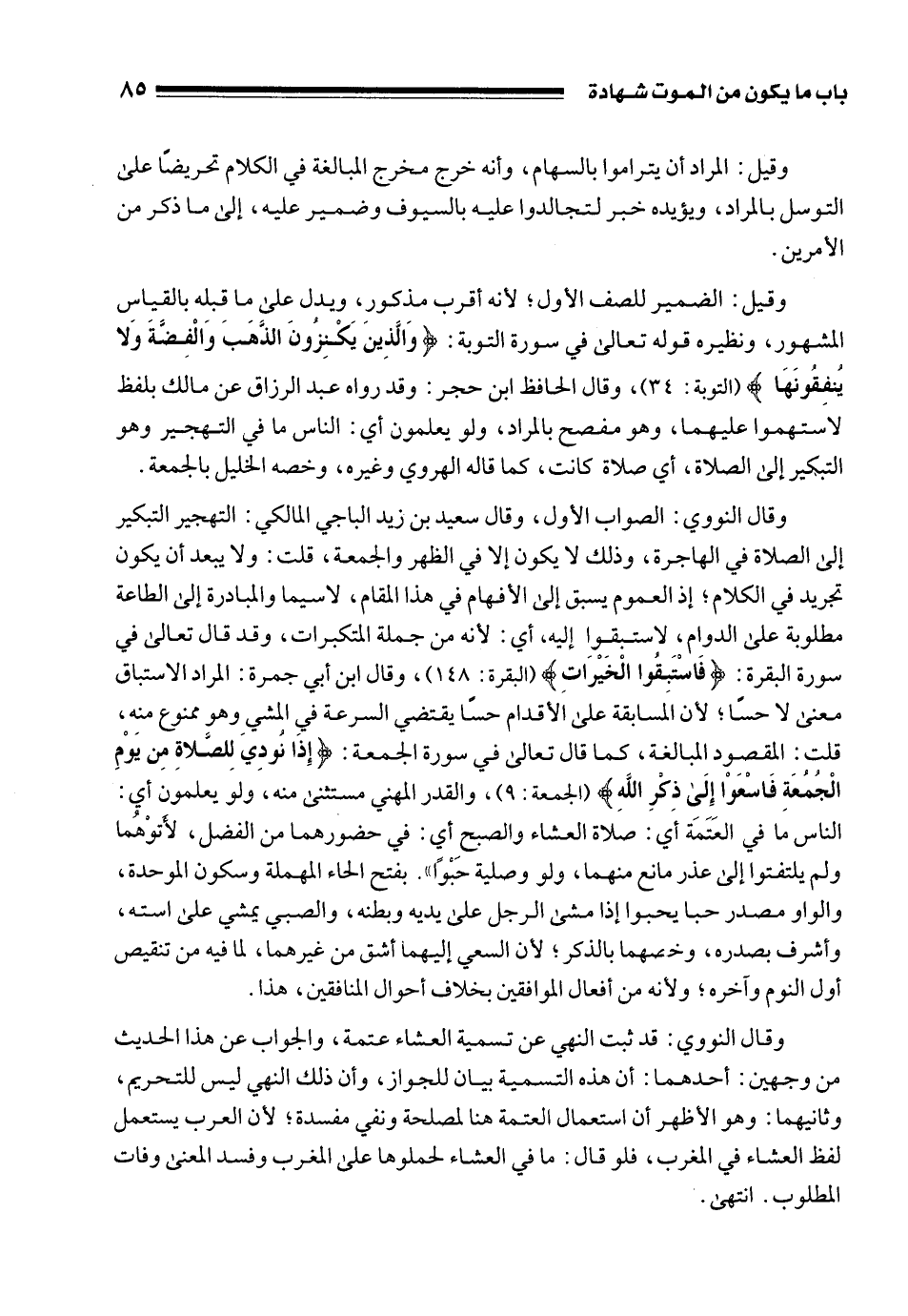 وقال النووي: الصواب الأول، وقال سعيد بن زيد الباجي المالكي: التهجير التبكير إلى الصلاة في الهاجرة، وذلك لا يكون إلا في الظهر والجمعة، قلت: ولا يبعد أن يكون تجريد في الكلام؛ إذ العموم يسبق إلى الأفهام في هذا المقام، لا سيما والمبادرة إلى الطاعة مطلوبة على الدوام، لاستبقوا إليه، أي: لأنه من جملة المتكبرات، وقد قال تعالى في سورة البقرة: {فَاسْتَبِقُوا الْخَيْرَاتِ} [البقرة: 148]، وقال ابن أبي جمرة: المراد الاستباق معنى لا حسًا؛ لأن المسابقة على الأقدام حسًا يقتضي السرعة فيِ المشي وهو ممنوع منه، قلت: المقصود المبالغة، كما قال تعالى في سورة الجمعة: {إِذَا نُودِيَ لِلصَّلَاةِ مِنْ يَوْمِ الْجُمُعَةِ فَاسْعَوْا إِلَى ذِكْرِ اللَّهِ} [الجمعة: 9]، والقدر المهني مستثنى منه، ولو يعلمون أي: الناس ما في العَتَمَة أي: صلاة العشاء والصبح أي: في حضورهما من الفضل، لأَتوْهُما ولم يلتفتوا إلى عذر مانع منهما، ولو وصلية حَبْوًا". بفتح الحاء المهملة وسكون الموحدة، والواو مصدر حبا يحبوا إذا مشى الرجل على يديه وبطنه، والصبي يمشي على استه، وأشرف بصدره، وخصهما بالذكر؛ لأن السعي إليهما أشق من غيرهما، لما فيه من تنقيص أول النوم وآخره؛ ولأنه من أفعال الموافقين بخلاف أحوال المنافقين، هذا.