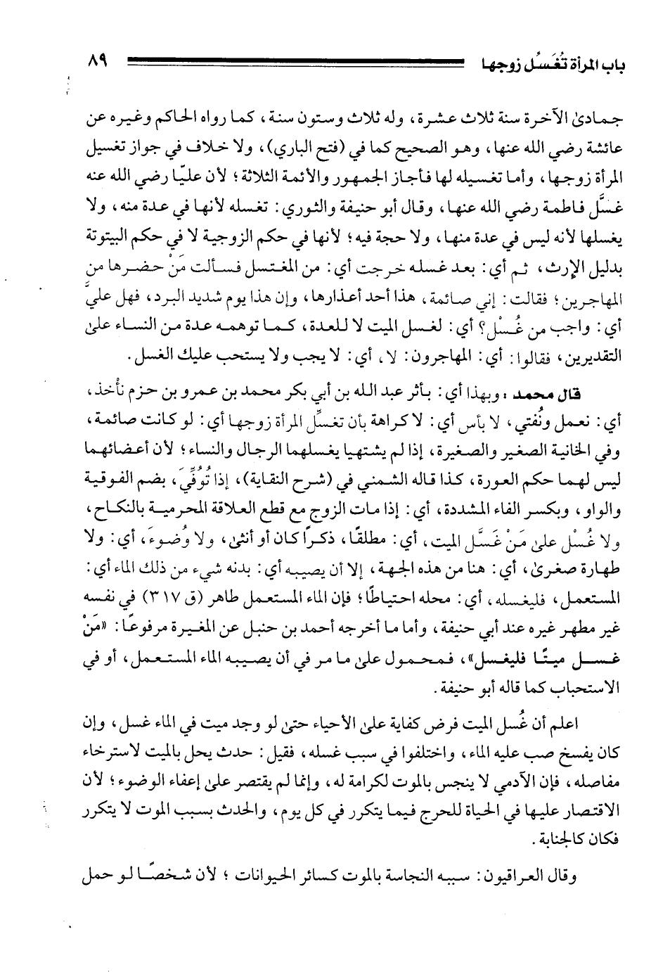 قال محمد: وبهذا أي: بأثر عبد الله بن أبي بكر محمد بن عمرو بن حزم نأْخذ، أي: نعمل ونُفتي، لا بأس أي: لا كراهة بأن تغسِّل المرأة زوجها أي: لو كانت صائمة، وفي الخانية الصغير والصغيرة، إذا لم يشتهيا يغسلهما الرجال والنساء؛ لأن أعضائهما ليس لهما حكم العورة، كذا قاله الشمني في (شرح النقاية)، إذا تُوُفِّيَ، بضم الفوقية والواو، وبكسر الفاء المشددة، أي: إذا مات الزوج مع قطع العلاقة المحرمية بالنكاح، ولا غُسْل على مَنْ غَسَّل الميت، أي: مطلقًا، ذكرًا كان أو أنثى، ولا وُضوءَ، أي: ولا طهارة صغرى، أي: هنا من هذه الجهة، إلا أن يصيبه أي: بدنه شيء من ذلك الماء أي: المستعمل، فليغسله، أي: محله احتياطًا؛ فإن الماء المستعمل طاهر (ق 317) في نفسه غير مطهر غيره عند أبي حنيفة، وأما ما أخرجه أحمد بن حنبل عن المغيرة مرفوعًا: "مَنْ غسل ميتًا فليغسل"، فمحمول على ما مر في أن يصيبه الماء المستعمل، أو في الاستحباب كما قاله أبو حنيفة.