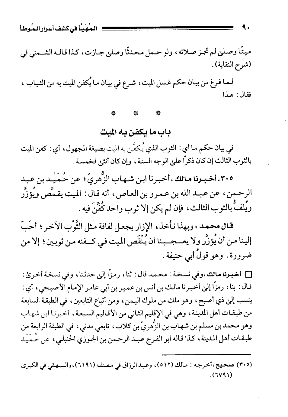 305 - أخبرنا مالك، أخبرنا ابن شهاب الزُّهريّ؛ عن حُمَيْد بن عبد الرحمن، عن عبد الله بن عمرو بن العاص، أنه قال: الميت يقمَّص ويُؤزَّر ويُلفُّ بالثوب الثالث، فإن لم يكن إلا ثوب واحد كُفِّنَ فيه.
