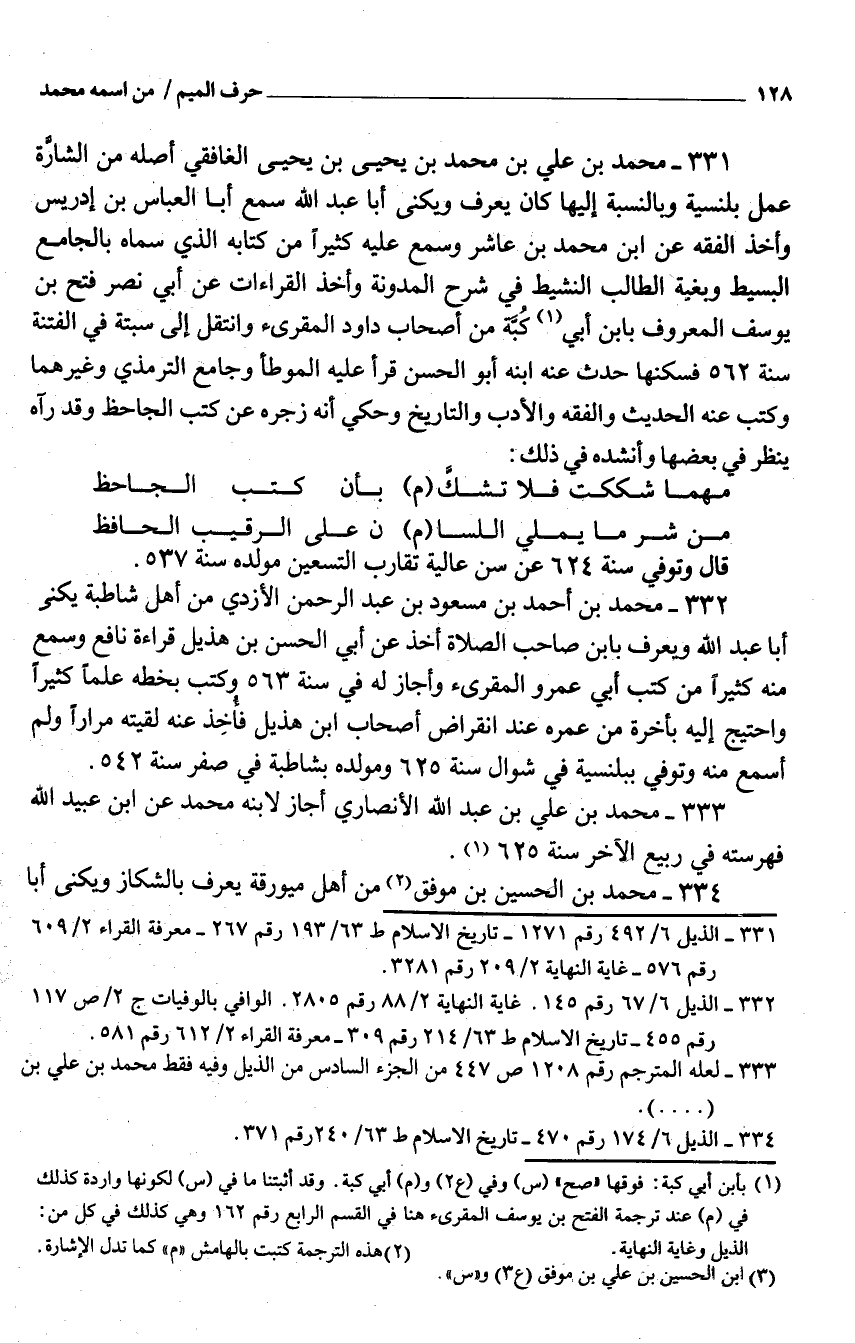 331 - مُحَمَّد بْن عَلِيّ بْن مُحَمَّد بْن يحيى بْن يحيى الغافقي أَصله من الشارة عمل بلنسية وبالنسبة إِلَيْهَا كَانَ يعرف ويكنى أَبَا عَبْد اللَّه سَمِعَ أَبَا الْعَبَّاس بن إِدْرِيس واخذ الْفِقْه عَن ابْن مُحَمَّد بن عَاشر وَسمع عَلَيْهِ كثيرا من كِتَابه الَّذِي سَمَّاهُ بالجامع الْبَسِيط وبغية الطَّالِب النشيط فِي شرح الْمُدَوَّنَة وَأخذ الْقرَاءَات عَن أبي نصر فتح بن يُوسُف الْمَعْرُوف بِابْن أبي كبة من أَصْحَاب دَاوُد المقرىء وانتقل إِلَى سبتة فِي الْفِتْنَة سنة 562 فسكنها حدَّث عَنْهُ ابْنه أَبُو الْحسن قَرَأَ عَلَيْهِ الْمُوَطَّأ وجامع التِّرْمِذِيّ وَغَيرهمَا وَكتب عَنهُ الحَدِيث وَالْفِقْه وَالْأَدب والتاريخ وَحكى أَنه زَجره عَن كتب الجاحظ وَقد رَآهُ ينظر فِي بَعْضهَا وأنشده فِي ذَلِك