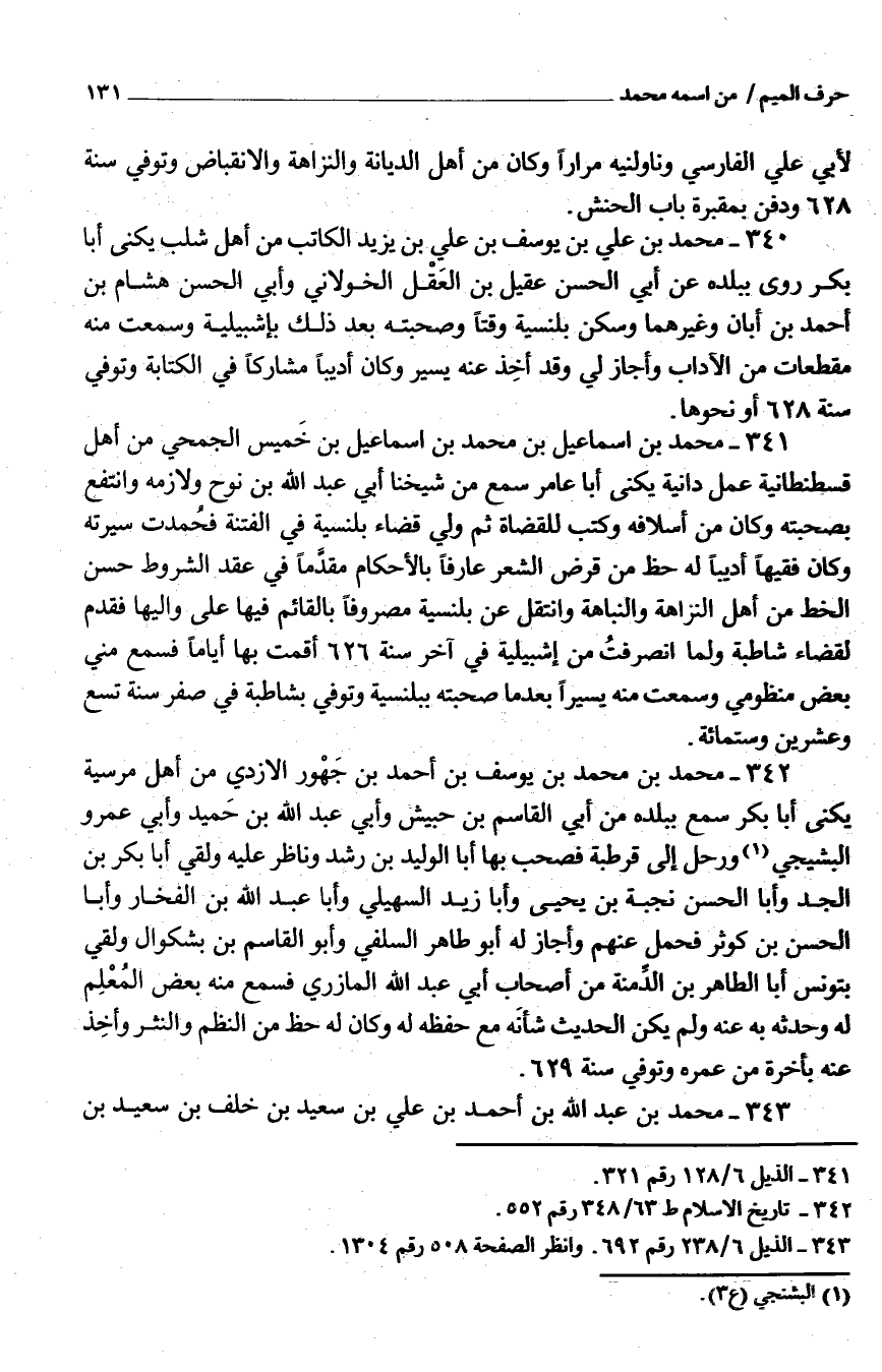 341 - مُحَمَّد بن إِسْمَاعِيل بْن مُحَمَّد بْن إِسْمَاعِيل بْن خَمِيس الجُمَحِي من أهل قسطنطانية عمل دانية يكنى أَبَا عَامر سمع من شَيخنَا أبي عبد الله بن نوح ولازمه وانتفع بِصُحْبَتِهِ وَكَانَ من أسلافه وَكتب للقضاة ثمَّ ولي قَضَاء بلنسية فِي الْفِتْنَة فحمدت سيرته وَكَانَ فَقِيها أديبًا لَهُ حَظّ من قرض الشّعْر عَارِفًا بِالْأَحْكَامِ مقدما فِي عقد الشُّرُوط حسن الْخط من أهل النزاهة والنباهة وانتقل عَن بلنسية مصروفا بالقائم فِيهَا على واليها فَقدم لقَضَاء شاطبة وَلما انصرفت من إشبيلية فِي آخر سنة 626 أَقمت بهَا أَيَّامًا فَسمع مني بعض منظومي وَسمعت مِنْهُ يَسِيرا بَعْدَمَا صحبته ببلنسية وَتُوفِّي بشاطبة فِي صفر سنة تسع وَعشْرين وسِتمِائَة